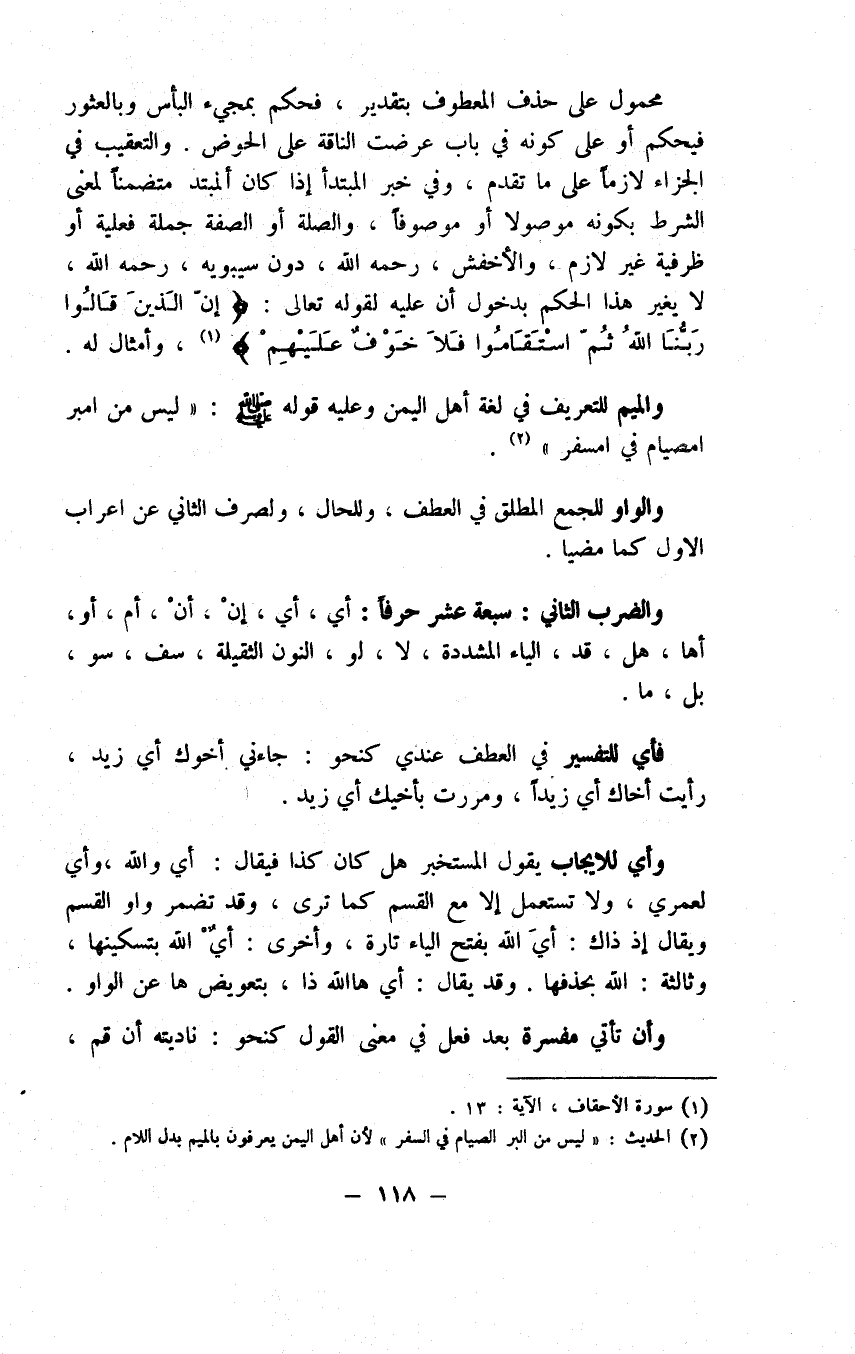 ذلك كاسم الفاعل إلا أنه يعمل عمل فعله المبني للمفعول. والصفة المشبهة معتمدة تعمل عمل فعلها كنحو زيد كريم أبواه، وأما أفعل التفضيل فلا ينصب مفعولا به ألبتة والسبب في ذلك عندي ما نبهت عليه في القسم الأول من أن بناءه من باب أفعال الطبائع، وقد عرفت أنه لا يتعدى في رفعه للمظهر دون المضمر للأكثر منع، وقد روي على الممنوع قوله صلى الله عليه وسلم " ما من أيام أحب على الله الصوم فيها من عشر ذي الحجة " بفتح أحب وقولهم ما رأيت رجلا أحسن في عينيه الكحل منه في عين زيد بنصب أحسن. وشأن اسم الفعل في باب الرفع والنصب شأن مسماه وتقديم المرفوع على الرافع في جميع ذلك ممتنع وكذا حذفه اللهم إلا عند المصدر كقوله تعالى " أو إطعام في يوم ذي مسغبة يتيما " ولا يقال لعله مضمر إذ لو كان يضمر للزم أن يصح نحو أعجبني من هذا الأمر ظهور كله على نحو إن ظهر كله وليس يصح، ومن شأنه إذا كان ضميرا مستكناً ولا يستكن في المصدر أن يبرز ألبتة إذا جرى متضمنه على غير ما هو له سواء كان الموضع موضع التباس كنحو زيد عمرو ضاربه هو أولم يكن كنحو زيد هند ضاربها هو أو زيد الفرس راكبه هو. أما ما ينصب التمييز من غير ذلك فهو كل اسم يكون محلا للإبهام وهو ضمير كنحو ويحه رجلا ولله دره فارسا وحسبك به ناصرا وربه كريما وغير ذلك وصحة اقتران من بما ذكرنا تنفي وهم كونها أحوالا، أو مضافا ما في السماء موضع كف سحابا ولي ملء الإناء ماء ومثل الثمرة زبدا أوفيه نون جمع أو تثنية كعشرون درهما ومنوان سمنا أو تنون ظهرا كنحو عندي راقود حلا ورطل زيتا وكأي رجلا أو تقديرا كأحد عشر درهما وكم رجلا في الاستفهام وكم في الدار رجلا في الخير إذا فصلت وكذا وكذا دينارا وتقديم المنصوب هنا على الناصب ممتنع. لك كاسم الفاعل إلا أنه يعمل عمل فعله المبني للمفعول. والصفة المشبهة معتمدة تعمل عمل فعلها كنحو زيد كريم أبواه، وأما أفعل التفضيل فلا ينصب مفعولا به ألبتة والسبب في ذلك عندي ما نبهت عليه في القسم الأول من أن بناءه من باب أفعال الطبائع، وقد عرفت أنه لا يتعدى في رفعه للمظهر دون المضمر للأكثر منع، وقد روي على الممنوع قوله صلى الله عليه وسلم " ما من أيام أحب على الله الصوم فيها من عشر ذي الحجة " بفتح أحب وقولهم ما رأيت رجلا أحسن في عينيه الكحل منه في عين زيد بنصب أحسن. وشأن اسم الفعل في باب الرفع والنصب شأن مسماه وتقديم المرفوع على الرافع في جميع ذلك ممتنع وكذا حذفه اللهم إلا عند المصدر كقوله تعالى " أو إطعام في يوم ذي مسغبة يتيما " ولا يقال لعله مضمر إذ لو كان يضمر للزم أن يصح نحو أعجبني من هذا الأمر ظهور كله على نحو إن ظهر كله وليس يصح، ومن شأنه إذا كان ضميرا مستكناً ولا يستكن في المصدر أن يبرز ألبتة إذا جرى متضمنه على غير ما هو له سواء كان الموضع موضع التباس