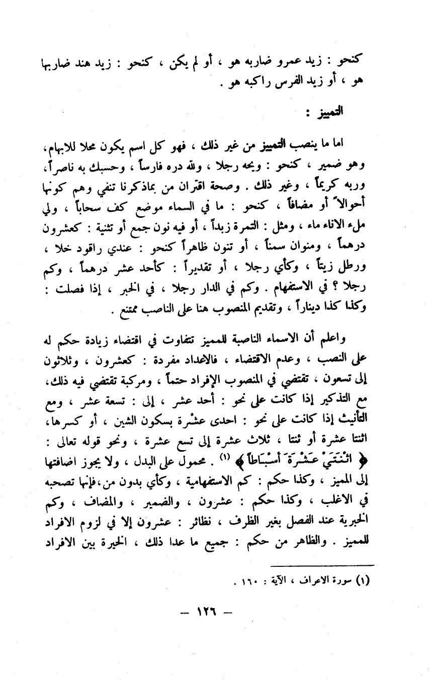 وآخرين وأخرى وأخريين وأخر وأخريات وإلا دنيا في مؤنثة فإنها استعملت بغير حرف التعريف. قال العجاج: في سعي دنيا طالما قدمت رجلي أيضا. ومن ذلك هلم في لغة بني تميم فإنهم يقولون هلما هلموا هلممن، والظاهر من حكم أسماء الأفعال امتناع ذلك وعليه أهل الحجاز فيه ولذلك حيث قالوا هاتيا هاتوا هاتي هاتين اخترنا منع اسمية هات على ارتكاب نوع من الخفاء في اشتقاقه، ومن ذلك ها فإنه تلحق آخره همزة للخطاب ويصرف مع المخاطب في أحواله تصريف كاف الخطاب، والظاهر من هذا الاستعمال فيما عداه العدم. وأما الجزم فللفعل إذا أفاد فيه معنى الشرط والجزاء والأسماء التي تفيد ذلك هي من نحو من يكرمني أكرمه وأي نحو أيهم يأنني أكرمه وأنى نحو فأصبحت أنى تأتها تلتبس بها وإذا ما نحو وإذ ما تخرج أخرج وحيثما نحو حيثما تجلس أجلس وأين نحو أين تكن أكن ومتى نحو متى تركب أركب وتدخل عليهما ما لزيادة الإبهام فيقال أينما ومتى ما، وما نحو ما تصنع أصنع وتدخل عليها عند قوم ما الإبهامية فتصير ماما فتستشبع فيجعل مهما وعند آخرين تدخل على مذ وإذا في الشعر وإذما، وبسط الكلام في معاني هذه الأسماء موضعه علم المعاني، ولمعنى الشرط في إذا دون إذ حمل الرفع في نحو " إذا السماء انشقت " على نحو ما حمل في إن ذو لوثة لأنا ونظائره، ولنقتصر من النوع الاسمي على هذا القدر وإلا فإن خيط الكلام فيه مما لا يكاد ينقطع.