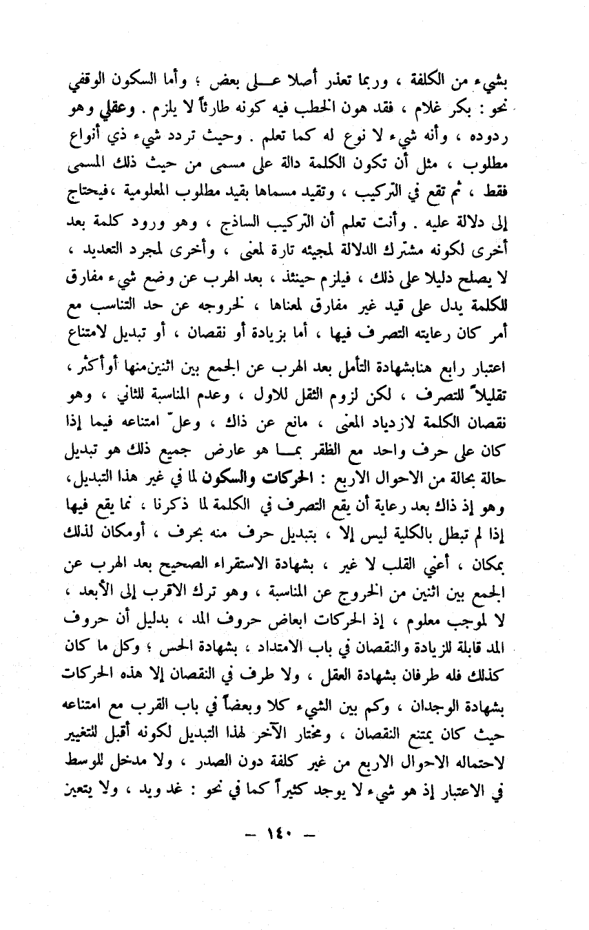وقد كان أنثها التكسير فأنث العدد ثم لما انتهى الأمر على اعتبار النسوة واستهجن إلغاء الفرق ومنع عن زيادة التاء الأخرى امتناع اجتماع علامتي التأنيث لزم حذف التاء وأمر آخر وهو لفظ الشيء يقع على كل مذكر ومؤنث ثم إنه لا يستعمل إلا مذكرا فلولا أن التذكير أصل لوقع التغليب للفرع ولخرج عن القياس والعجمة ثانية للغتهم العربية لطروئها عليها الطارئ على الشيء بعد المطروء عليه في بابه والعدل ثان للمعدول عنه وأمره ظاهر والجمع ثان للجنس من حيث أن الجمعية قيد للجنس ووجود الشيء من حيث هو مطلقا قبل وجوده من حيث هو مقيدا في باب الاعتبار والفعل الذي هو ثان للاسم لا بد من أن يكون وزنه المختص به ثانيا لوزن الاسم. وأما الألف والنون الزائدتان وألف الإلحاق فالأمر فيهما أبين والوصف والتركيب والعلمية أمرها على نحو أمر الجمع فمتى اجتمع في الاسم منها ما لا يقصر به عن أن يصير ثانيا باعتبارين وذلك بحصول اثنين منها أو الجمع أو ألف التأنيث وستعرف السر أشبه الفعل فيمنع منه التنوين لما ذكرنا، ولهذا ينتظر في منعه الخفيف من الأسماء خاصة كالثلاثي الساكن الحشو تقوي الشبه بازدياده مما يكسوه ذلك في اللغة الفصحى، وإذا علمت أن العلة في منع الصرف هي ما ذكرنا تنبهت للمعنى في جواز صرفه للشاعر المضطر وتنبهت أيضا للمعنى الذي لأجله شرطت منها اللائي عددنا بما شرطت وهو اكتسابها به قوة حال أو زيادة ظهور أو تحققا، ألا يرى أن المؤنث بالتاء إذا لم يكن كان للتاء من احتمال الانفصال ما لا يكون لها بعد العلمية وكم بين الشيء لازما وغير لازم، ومن هذا تتبين أن ألف التأنيث أقوى حالاً من التاء لأنها لا تنفصل عن الكلمة بحال وهو السبب عند أصحابنا رحمهم الله في أن أقيمت مقام اثنين، وأما نحو آخر عناق وعقرب فإنما سلك به مسلك التاء تفاديا مما في غير ذلك من ارتكاب خلاف قياس وهو جعل الفرع أقوى من الأصل لأنه فرع على التاء وإذا كانوا لا يسوغون التسوية بينه وبين التاء