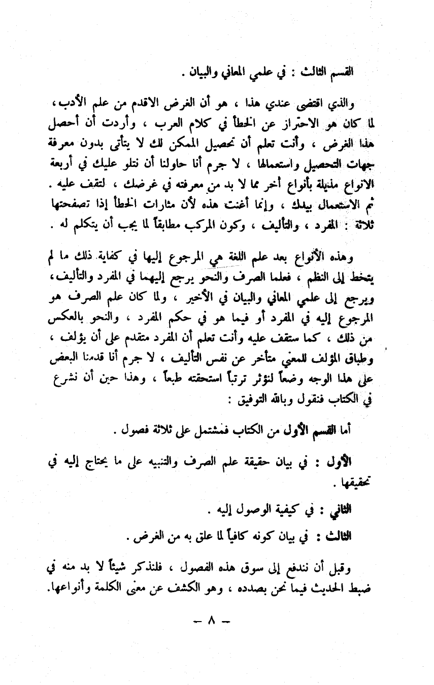 الجانبين ثم ترد التباين على أعم وهو المباينة من جانب في لفظ باين ثم ترده على أعم وهو حصول البينونة في لفظ بان ثم ترده على أعم وهو مجرد البين، وهذا هو الذي يعنيه أصحابنا في هذا النوع بالاشتقاق ثم إذا اقتصرت في التجنيس على ما تحتمله حروف كل طائفة بنظم مخصوص كمطلق معنى البينونة فيما ضربنا من المثال للباء ثم الياء ثم النون وهو المتعارف سمي الاشتقاق الصغير وإن تجاوزت على ما احتملته من معنى أعم من ذلك كيفما انتظمت مثل الصور الست للحروف الثلاثة المختلفة من حيث النظم والأربع والعشرين للأربعة والمائة والعشرين للخمسة سمي الاشتقاق الكبير. وههنا نوع ثالث من الاشتقاق كان يسميه شيخنا الحاتمي رحمه الله الاشتقاق الأكبر، وهو أن يتجاوز على ما احتملته أخوات تلك الطائفة من الحروف نوعاً أو مخرجا وقد عرفت الأنواع والمخارج على ما نبهناك وأنه نوع لم أر أحداً من سحرة هذا الفن وقليل ما هم حام حوله على وجهه إلا هو وما كان ذلك منه تغمده الله برضوانه وكساه حلل غفرانه إلا لكونه الأول والآخر في علماء الفنون الأدبية على علوم أخر " ولا ينبئك مثل خبير ". وسلوك هذا الطريق على وجهين أصل فيما يطلب منه وملحق به. أما الأصل فهو إذا ظفرت بأمثلة ترجع معانيها الجزئية على معنى كلي لها أن تطلب فيها من الحروف قدراً تشترك هي فيه وهو يصلح للوضع الكلي على أن لا تمتنع عن تقدير زيادة أو حذف أو تبديل إن توقف مطلوبك على ذلك وعن تقدير القلب أيضاً في الاشتقاق الصغير معينا كلا من ذلك بوجه يشهد له سوى وجه الضبط فهو بمجرده لا يصلح لذلك وتلك الحروف تسمى أصولاً والمثال الذي لا يتضمن إلا إياها مجرداً وما سوى تلك الحروف زوائد والمتضمن لشيء منها م وإذا أريد أن يعبر عن الأصول عبر عن أولها في ابتداء الوضع بالفاء وعن ثانيها