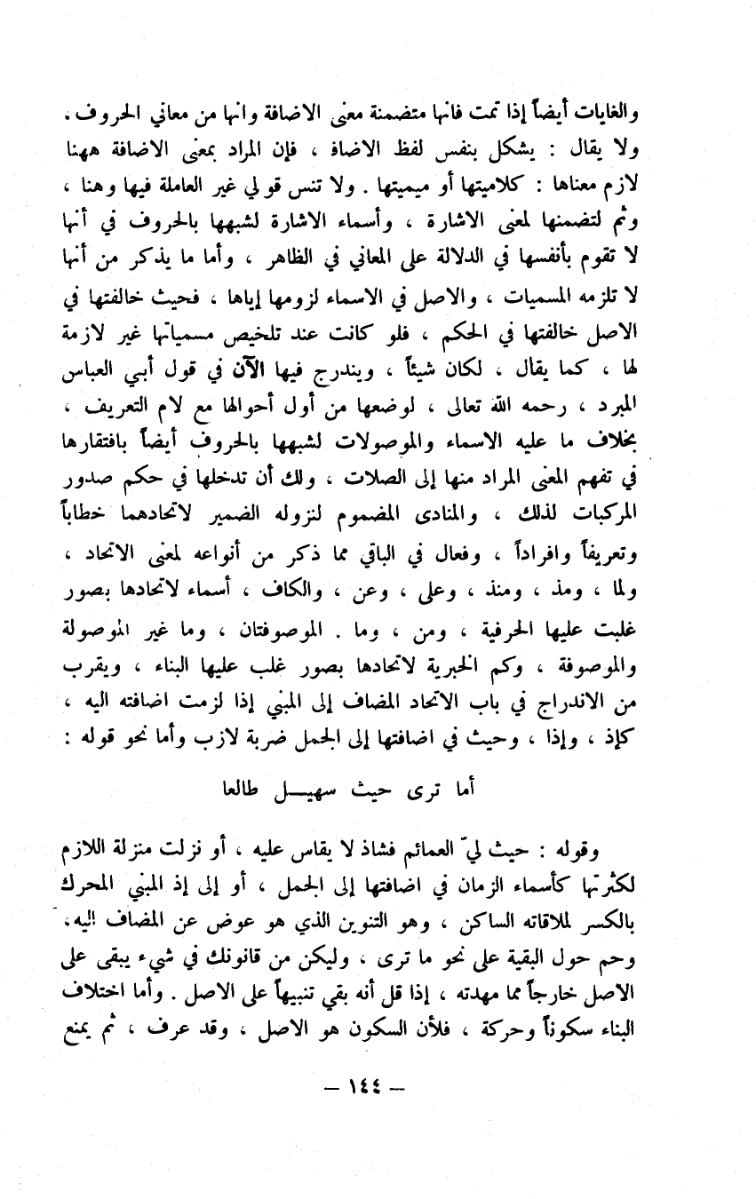 للاشتراك في الحروف وحين آل الأمر على جعل بعض الحروف مشتركا دون بعض تعينت الياء التي من شأنها استواء النسبة إلى النسبة إلى الخفة والثقل وإلى مخرجى أختيها للاشتراك الذي من شأنه استواء النسبة إلى المعنيين وانقسمت أختاها على التثنية والجمع لجهتي التقدم والتأخر ثم لما قدم الرفع في الاعتبار كونه حصة الفاعل المتقدم فيه كما سبق تعينت له ثم تعينت الياء لأخويه فيهما وأصلا للجر منهما لما بينهما وبينه من النسب ما ليس بينها وبين النصب فحصل إعراب المثنى والمجموع على ما ترى، وأما النون فالأقرب فيه أنه لما اعتبر الإعراب الذي هو للاسم بحكم الأصالة في التثنية والجمع على حدها للجهة المذكورة واستهجن إلغاؤه فيهما لمناسبات تآخذت في ذلك امتنع بحكم رعاية ذلك بناء المثنى والمجموع جمع السلامة، ولذلك اختلف في نحو ذان واللذان واللذون والذين بين أن يحكم فيها بالتثنية والجمع وبين أن لا يحكم فتنظم في سلك أبانان وعمايتان وعشرون وثلاثون وما شاكل ذلك ولم يكن الاسم يدخل بالتثنية والجمع على حدهما في باب ما لا ينصرف لم يصادفوا في ترك التنوين عذرا يعتبر فأنى به وحرك محافظة على الساكن قبله إذ كان دأبهم تحريكه لنوع من العذر كنحو غلام اكتهل وكسر بعد الألف على أصل تحريك الساكن وفتح بعد أختيها تفاديا من الجمع بينهما وبين الكسر لأصول مقررة، وحيث استمرت الحركة عليه صار بمنزلة غير التنوين فلم يحذف في الوقف ولا مع نفي الجنس ولا مع الألف واللام ولا مع النداء على الضم، وإنما بنيت الكلام على الحذف لامتناع تأخير التثنية والجمع في ذلك كله لاستلزامه تحصيل الممتنع أما في الوقف فلاستلزامه الوصل في الوقف وأما في نفي الجنس فلاستلزامه طلب الزيادة حيث لا مزيد. وأما في المعرف وهو الداخل عليه اللام أو المضموم في النداء فلاستلزامه تحصيل التثنية والجمع لامع الصحة، ألا ترى أن التثنية والجمع طريقان ليتناول الاسم بهما أكثر مما هو متناوله فيستلزم تحصيلهما بحكم الضرورة صحة تناول المزيد المنافية للاختصاص