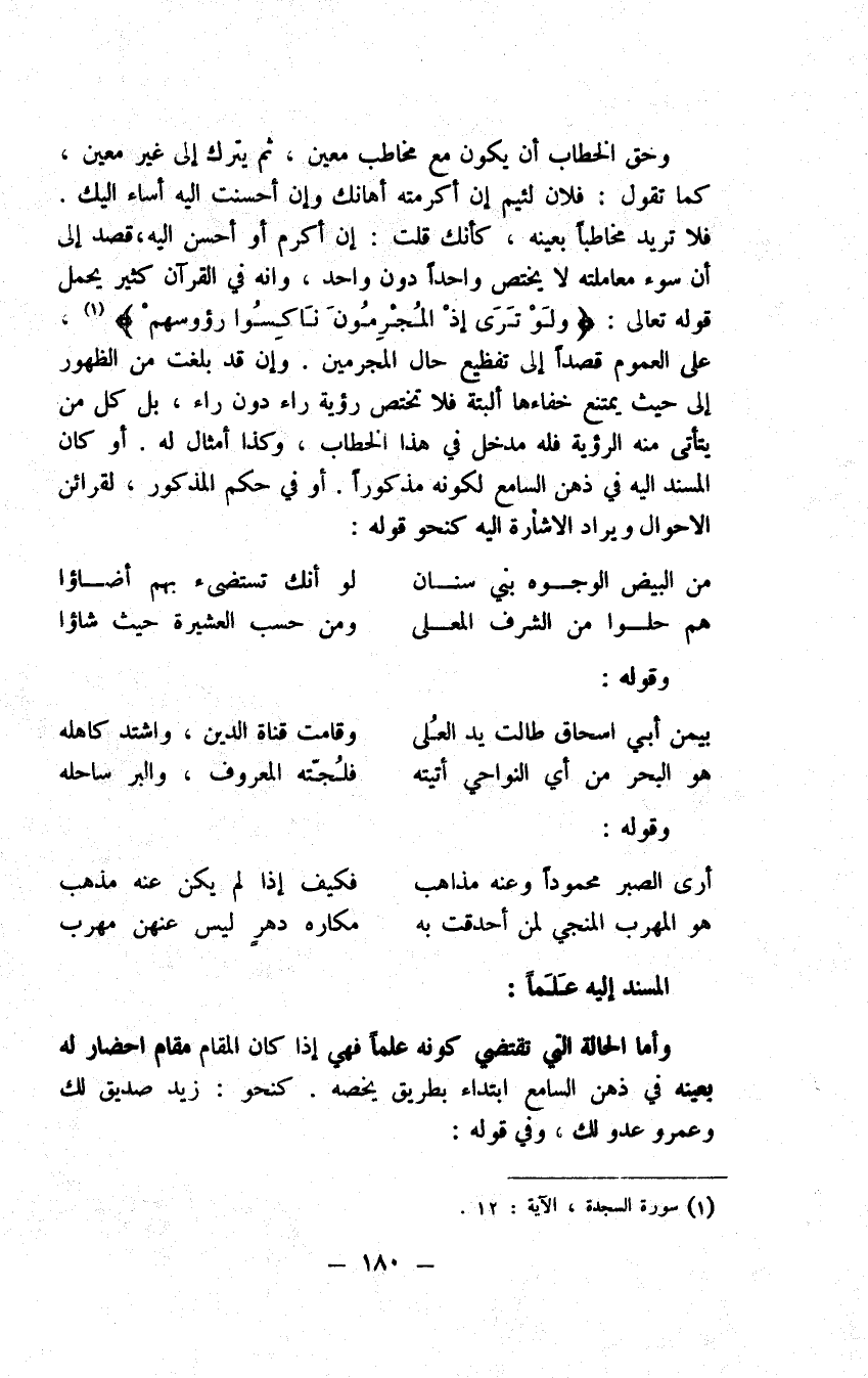 أو مثل أن تتضمن نوع تعظيم باعتبار كما تقول عبدي حضر فتعظم شأنك أن لك عبدا، أو كما تقول عبد الخليفة حضر فتعظم شأن العبد، أو كما تقول عبد الخليفة عند فلان فتعظم شأن فلان، أو نوع تحقير كما تقول ولد الحجام عنده، أو غرضا من الأغراض ممكن التعلق بالإضافة، وأما الحالة التي تقتضي وصف المعرف فهي إذا كان الوصف مبينا كاشفا عنه كما إذا قلت الجسم الطويل العريض العميق محتاج على فراغ يشغله، أو قلت التقي الذي يؤمن ويصلي ويزكي على هدى من ربه فبينت بالوصف على ألطف وجه أن المتقي هو الذي يفعل الواجبات بأسرها ويجتنب الفواحش والمنكرات عن آخرها وكشفته كشفا كأنك حددته، ووجه اللطافة هو أنك ذكرت أساس الحسنات ومنصبها وهو الإيمان وعقبته بأمي العبادات البدنية والمالية المستتبعتين لسائر العبادات وهما الصلاة والزكاة فأفدت بذلك فعل الواجبات بأسرها وذكرت الناهي عن الفحشاء والمنكر وهو الصلاة فأفدت بذلك اجتناب الفواحش عن آخرها ونظيره في تنزيل الوصف منزلة الكاشف للمجري عليه قول أوس: