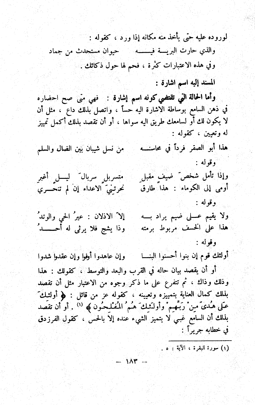 وأما الحالة التي تقتضي بيانه وتفسيره فهي إذا كان المراد زيادة إيضاحه بما يخصه من الاسم كقولك صديقك خالد قدم وقوله علت كلمته " لا تتخذوا الهين اثنين إنما إله واحد " من هذا القبيل شفع الهين باثنين وإله بواحد لأن لفظ إلهين يحتمل معنى الجنسية ومعنى التثنية، وكذا لفظ إله يحتمل الجنسية والوحدة والذي له الكلام مسوق هو العدد في الأول والوحدة في الثاني ففسر إلهين باثنين وإله بواحد بيانا لما هو الأصل في الغرض ومن هذا الباب من وجه قوله تعالى " وما من دابة في الأرض ولا طائر بجناحيه " ذكر في الأرض مع دابة ويطير بجناحيه مع طائر لبيان أن القصد من لفظ دابة ولفظ طائر إنما هو على الجنسين وعلى تقريرهما. وأما الحالة التي تقتضي البدل عنه فهي إذا كان المراد نية تكرير الحكم وذكر المسند إليه بعد توطئة ذكره لزيادة التقرير والإيضاح كقولك سلب زيد ثوبه وجاء القوم أكثرهم وحق عليك الصراط المستقيم صراط الذين أنعم الله عليهم في الأنواع الثلاثة من البدل دون الرابع فليتأمل. وأما الحالة التي تقتضي العطف فهي إذا كان المراد تفصيل المسند إليه مع اختصار كقولك جاء زيد وعمرو وخالد أو تفصيل المسند مع اختصار كقولك جاء زيد فعمرو فخالد أو ثم عمرو