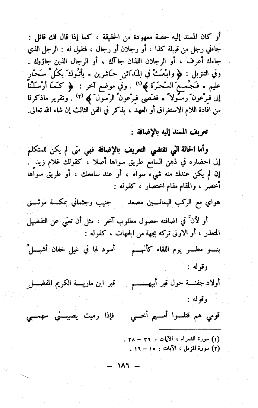 منه أيضا انظر إليه كيف تجد الفهم والذوق يقتضيانك كمال ارتفاع شأن حاجب الأول وكمال انحطاط حاجب الثاني. وقال تعالى " وعلى أبصارهم غشاوة " فنكر لتهويل أمرها. وقال " ولكم في القصاص حياة " على معنى ولكم في هذا الجنس من الحكم الذي هو القصاص حياة عظيمة لمنعه عما كانوا عليه من قتل الجماعة بواحد متى اقتدروا أو نوع من الحياة وهي الحياة الحاصلة بالارتداع عن القتل لمكان العلم بالاقتصاص أو ما ترى إذا هم بالقتل فتذكر الاقتصاص فأورثه أن يرتدع كيف يسلم صاحبه من القتل وهو من القود فيتسبب لحياة نفسين ولمعنى طلب التعظيم والتهويل بالتنكير قال تعالى " فأذنوا بحرب من الله ورسوله " دون أن يقول بحرب الله ورسوله، ولخلاف ذلك قال " وعد الله المؤمنين والمؤمنات جنات تجري من تحتها الأنهار خالدين فيها