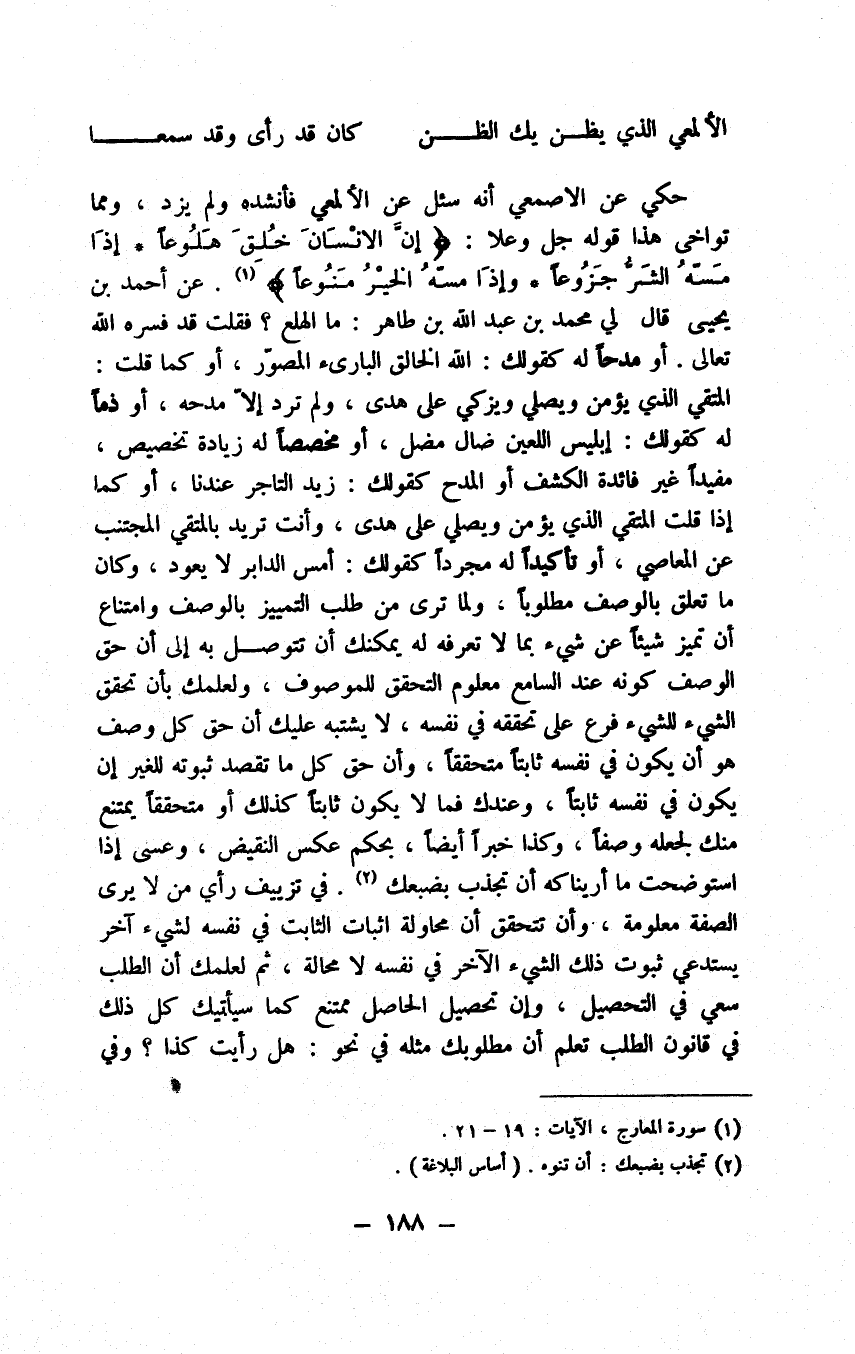 شئت فتزحلقه على العجز وتصير ما عداه صلة للذي إن كانت الجملة اسمية، وأما إن كانت فعلية فله أو للألف واللام بمعناه واضعا مكان المزحلق ضميرا عائدا على الموصول مراعيا في ذلك ما أفادك علم النحو مثل أن ضمير الشأن ملتزم التقديم وأن الضمير لا ينصب مفعولا وأن الحال لا يكون معرفا وأن ربط المعنى بالمعنى إذا كان بسبب عود الضمير فلا بد منه وأنا أضرب لك أمثلة لتتحقق جميع ذلك قل في الأخبار عن ضميرك في أظن الذباب يطير في الجو فيغضب أبا زيد الذي يظن الذباب يطير في الجو فيغضب أبا زيد أنا أو الظان الذباب وعن الذباب الذي أظنه يطير في الجو فيغضب أبا زيد الذباب وعن الجو الذي أظن الذباب يطير فيغضب أبا زيد الجو وعن أبي زيد الذي أظن الذباب يطير في الجو فيغضبه أبو زيد وعن زيد الذي وعن زيد الذي أظن الذباب يطير في الجو فيغضب أباه زيد ولا تخبر في قولك هو إكرامي قادما واجب عن ضمير الشأن لئلا يلزم تأخيره الممتنع ولا عن الإكرام لئلا يلزم أعمال الضمير الذي يقع موقعه في ولا عن قادما لئلا يلزم وقوع الضمير الذي هو معرفة موقع الممتنع عن التعريف وهو الحال ولا عن الضمير في واجب لئلا يلزم من عود الضمير القائم مقامه إذا عاد على الموصول كما يجب ترك ربط الخبر بالمبتدأ، وإما لأن يتقوى استناد الخبر إليه على الظاهر كما ستعرفه في الفن الثالث، وإما لأن اسم المسند إليه يصلح للتفاؤل فتقدمه على السامع لتسره أو تسوءه مثل أن تقول سعيد بن سعيد في دار فلان وسفاك بن الجراح في دار صديقك، وإما لأن كونه متصفا بالخبر يكون هو المطلوب كما إذا قيل لك كيف الزاهد فتقول الزاهد يشرب ويطرب وإما لتوهم أنه لا يزول عن الخاطر وأنه يستلذ فهو على الذكر أقرب، وإما لأن تقديمه ينبئ عن التعظيم والمقام يقتضي ذلك وإما لأنه يفيد زيادة تخصيص كقوله: