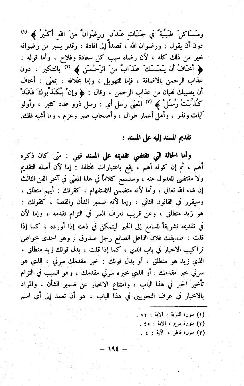 أو للحذاق المهرة في هذا الفن والعلماء النحارير، ومتى اختص موقعه بشيء من ذلك كساه فضل بهاء ورونق، وأورث السامع زيادة هزة ونشاط، ووجد عنده من القبول أرفع منزلة ومحل إن كان ممن يسمع ويعقل وقليل ما هم أم تحسب أن أكثرهم يسمعون أو يعقلون، ولأمر ما وقع التباين الخارج عن الحد بين مفسر لكلام رب العزة ومفسر وبين غواص في بحر فرائده وغواص، وكل التفات وارد في القرآن متى صرت من سامعيه عرفك ما موقعه، وإذا أحببت أن تصير من سامعيه فأصخ ثم ليتل عليك قوله تعالى " إياك نعبد وإياك نستعين " فلعلك ممن يشهد له الوجدان بحيث يغنيه عن شهادة ما سواه أليس أن المرء إذا أخذ في استحضار جنايات جان متنقلا فيها عن الإجمال على التفصيل وجد من نفسه تفاوتا في الحال بينا لا يكاد يشبه آخر حاله هناك أولها، أو ما تراك إذا كنت في حديث مع إنسان وقد حضر مجلسكما من له جنايات في حقك كيف تصنع تحول عن الجاني وجهك وتأخذ في الشكاية عنه على صاحبك تثبته الشكوى معددا جناياته واحدة فواحدة وأنت فيما بين ذلك واجد مزاجك يحمى على تزايد يحرك حالة لك غضبية تدعوك على أن تواثب ذلك الجاني وتشافهه بكل سوء وأنت لا تجيب على أن تغلب فتقطع الحديث مع الصاحب ومباثتك إياه وترجع على الجاني مشافها له بالله قل لي هل عامل أحد مثل هذه المعاملة هل يتصور معاملة أسوأ مما فعلت أما كان لك حياء يمنعك أما كانت لك مروءة تردعك عن هذا، وإذا كان الحاضر لمجلسكما ذا نعم عليك كثيرة فإذا أخذت في تعديد نعمه عند صاحبك مستحضرا لتفاصيلها أحسست من نفسك بحالة كأنها تطالبك بالإقبال على منعمك وتزين لك ذلك ولا تزال