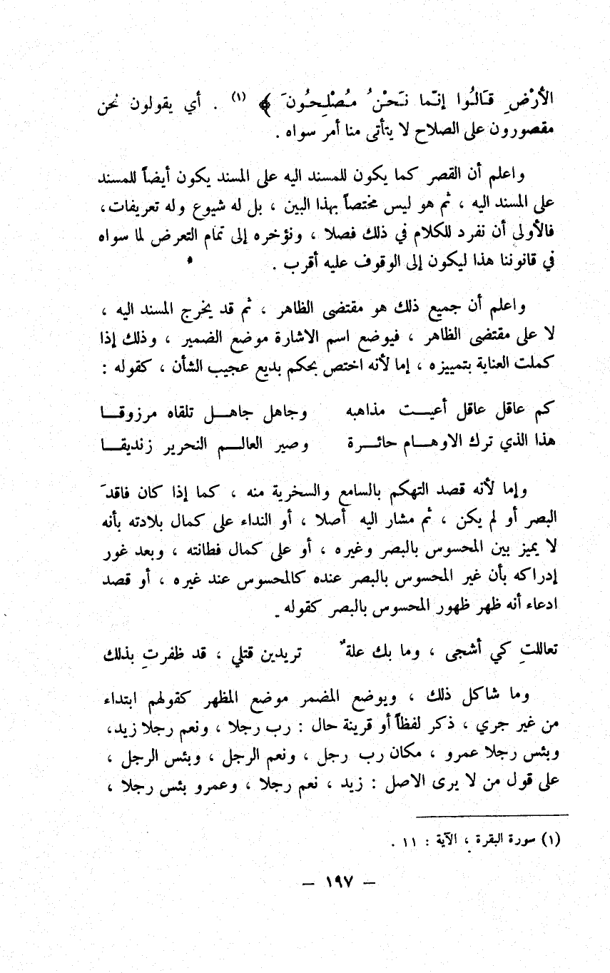 سننها المسلوك عند طوارق النوائب وبوارق المصائب فحين لم تفعل شككته في أنها نفسه فأقامها مقام مكروب ذي حرق قائلا له تطاول ليلك مسليا وفي التفاته الثاني على أن المتحزن تحزن تحزن صدق ولذلك لا يتفاوت الحال خاطبتك أم لم أخاطبك وفي التفاته الثالث على أن جميع ذلك إنما كان لما خصه ولم يتعداه على من سواه أو نبه في التفاته الأول على أن ذلك النبأ أطار قلبه وأبار لبه وتركه حائرا فما فطن معه لمقتضى الحال من الحكاية فجرى على لسانه ما كان ألفه من الخطاب الدائر في مجاري أمور الكبار أمراً ونهيا والإنسان إذا دهمه ما تحار له العقول وتطير له الألباب وتدهش معه الفطن لا يكاد يسلم كلامه عن أمثال ذلك وفي التفاته الثاني على أنه بعد الصدمة الأولى حين أفاق شيئاً مدركا بعض الإدراك ما وجد النفس معه فبنى الكلام على الغيبة قائلا وبات وباتت له وفي التفاته الثالث على ما سبق أونبه في التفاته الأول على أن نفسه حين لم تتثبت ولم تتبصر غاظه ذلك فأقامها مقام المستحق للعتاب قائلا له على سبيل التوبيخ والتعيير تطاول ليلك وفي الثاني على أن الحامل على الخطاب والعتاب لما كان هو الغيظ والغضب فحين سكت عنه الغضب بالعتاب الأول فإن سورة الغضب بالعتاب تنكسر ولي عنها الوجه وهو يدمدم قائلا وبات وباتت له وفي التفاته الثالث على ما تقدم وإنما ذكرت لك ما ذكرت لنقف على أن الفحول البزل لا يعترفون بالبلاغة لامرئ ولا يقيمون لكلامه وزنا ما لم يعثروا من مطاوى افتناناته على لطائف اعتبارات والتفاضل بين الكلامين قلما يقع إلا بأشباهها.