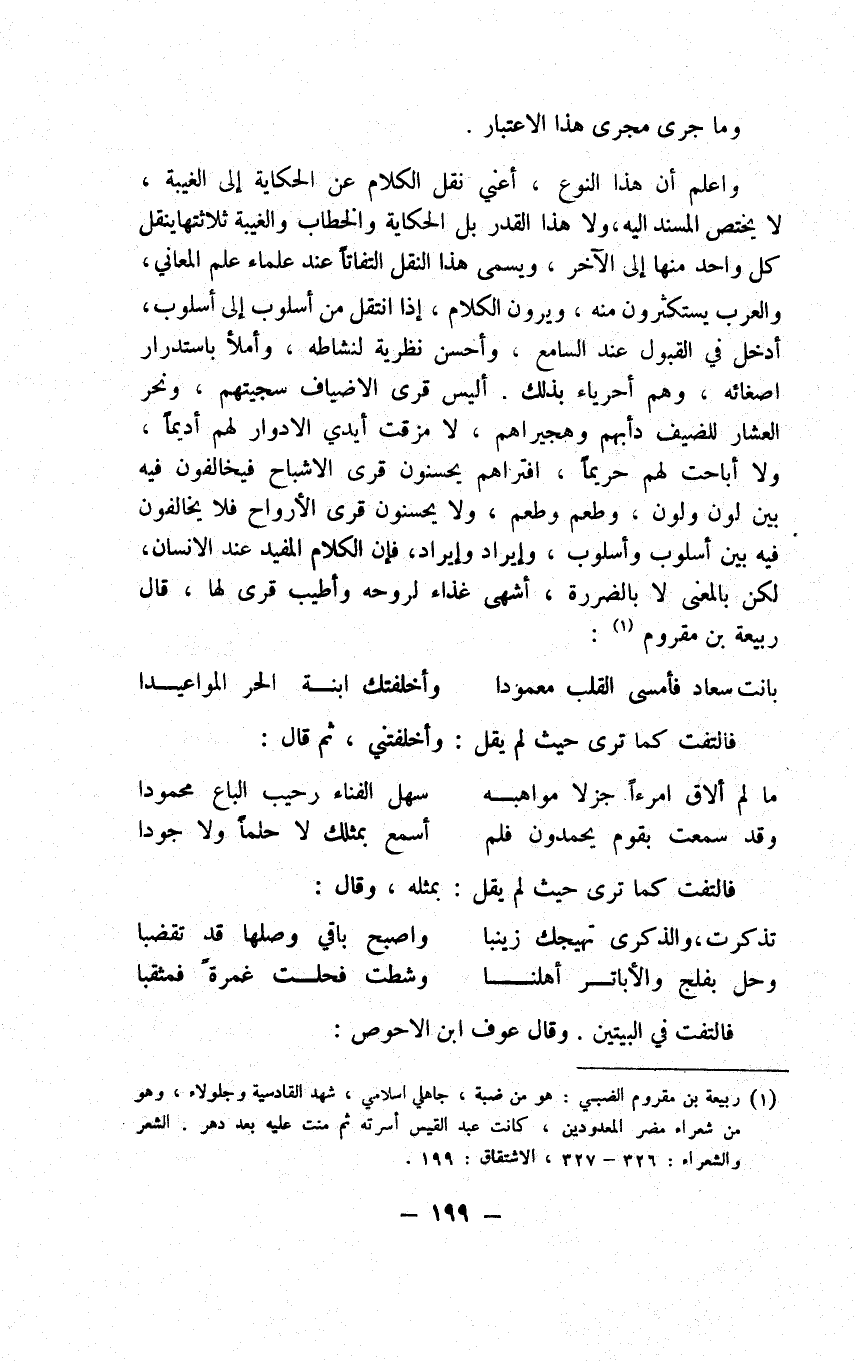 على حد مقتضاء على أقوم سمته فهو المطارح الذي تران فيه قوى القرائح والمطارد الذي يمتاز فيه الجدع عن القارح. أما الحالة المقتضية لترك المسند فهي متى كان ذكر المسند إليه بحال يعرف منه المسند وتعلق بتركه غرض: إما اتباع الاستعمال كقولهم ضربي قائما وأكثر شربي السويق ملتوتا وأحطب ما يكون الأمير قائما وقولهم. كل رجل وضيعته وقولهم لولا زيد لكان كذا ونحو ذلك، وأما قصد الاختصار والاحتراز عن العبث كما إذا قلت خرجت فإذا زيد أو قلت زيد منطلق وعمرو، وقوله عز من قائل " أفأنبئكم بشر من ذلكم النار " إذا حملته على تقدير النار شر من ذلكم، وأما ضيق المقام مع قصد الاختصار والاحتراز عن العبث كنحو قوله: