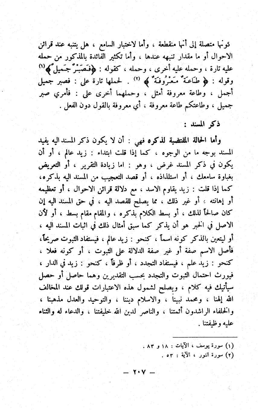تقدم أم تأخر فلا معرج عليه فإن المنطلق لا يجعل مبتدأ إلا بمعنى الشخص الذي له الانطلاق وأنه بهذا المعنى لا يجب كونه خبرا وأن لا يوقع خبرا إلا بمعنى صاحب اسم زيد ويكون المراد من قولنا المنطلق زيد الشخص الذي له الانطلاق صاحب اسم زيد. وأما ما قد يقع من نحو قوله ثم وإن لم أنم كرى كراكا ونحو قوله لعاب الأفاعي القاتلات لعابه مما لا يستقيم معناه إلا بالتقديم والتأخير فحقه الحمل على القلب المتقدم ذكره فاعرفه. واعلم أن القول بتعريف الحقيقة باللام واستغراقها مشكل إذا قلنا بتعريف الحقيقة القصد إليها وتمييزها من حيث هي هي لزم أن يكون أسماء الأجناس معارف فإنها موضوعة لذلك وأنه قول لم يقل به أحد، ولئن التزمه ملتزم ليكذبن في امتناع نحو رجع رجعي السريعة والبطيئة وذكر ذكرى الحسنة أو القبيحة وإنما لم أقل رجوعا السريع وذكرا الحسن قصراً للمسافة في التجنب عن حديث التنوين ما هي ولئن ذهبت على أن في نحو رجل وفرس وثور اعتبار الفردية فليس فيها القصد على الحقيقة من حيث هي هي ليلزمنك المصادر من نحو ضرب وقتل وقيام وقعود ورجعي وذكرى فليس فيها ذلك بالإجماع ولزم أن يكون اللام في الرجل أو نحو الضرب لتأكيد تعريف الحقيقة إذا لم يقصد العهد وأنه قول ما قال به أحد، وإذا قلنا المراد بتعريف الحقيقة القصد إليها حال حضورها أو تقدير حضورها لم يمتر عن تعريف العهد الوارد بالتحقيق أو بالتقدير لأن تعريف العهد ليس شيئاً غير القصد على الحاضر في الذهن حقيقة أو