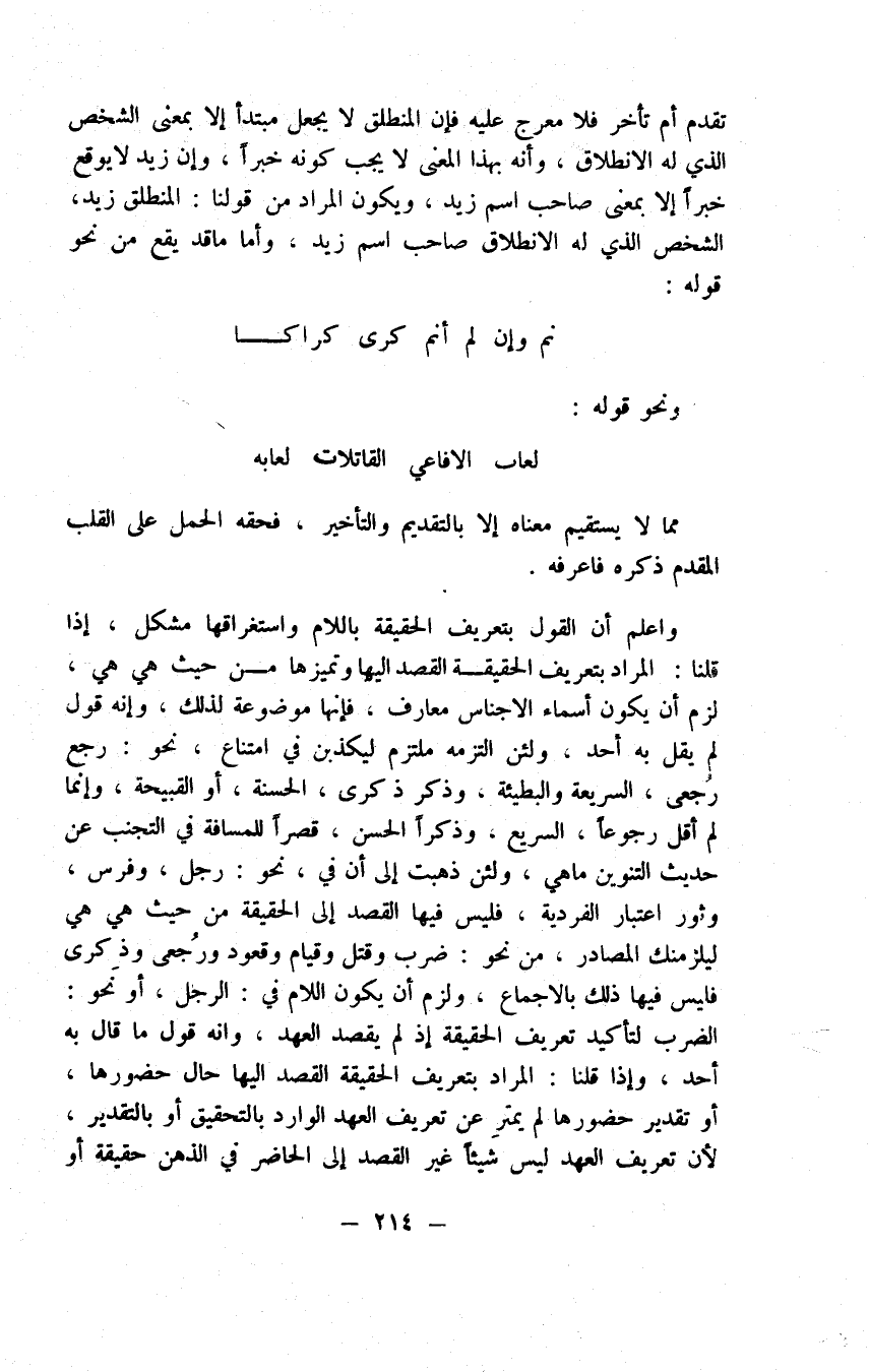 وحق هذا الاعتبار تطويل الكلام في المسند وإلا لم يحسن ذلك الحسن، أو يكون المراد بالجملة إفادة التجدد دون الثبوت فيجعل المسند فعلا ويقدم ألبتة على ما يسند إليه في الدرجة الأولى وقولي في الدرجة الأولى احتراز عن نحو أنا عرفت وأنت عرفت وزيد عرف، فإن الفعل فيه يستند على ما بعده من الضمير ابتداء ثم بوساطة عود ذلك الضمير على ما قبله يستند إليه في الدرجة الثانية وإذا سلكت هذه الطريقة سلكت باعتبارين مختلفين أحدهما أن يجري الكلام على الظاهر وهو أن أنا مبتدأ وعرفت خبره، وكذلك أنت عرفت وهو عرف ولا يقدر تقديم وتأخير كما إذا قلنا زيد عارف أو زيد عرف اللهم إلا في التلفظ. وثانيهما أن يقدر أصل النظم عرفت أنا وعرفت أنت وعرف هو، ثم يقال قدم أنا وأنت وهو فنظم الكلام بالاعتبار الأول لا يفيد إلا تقوي الحكم وسبب تقويه هو أن المبتدأ لكونه مبتدأ يستدعي أن يسند إليه شيء فإذا جاء بعده ما يصلح أن يستند إليه صرفه المبتدأ على نفسه فينعقد بينهما حكم سواء كان خاليا عن ضمير المبتدأ نحو غلامك أو كان متضمنا له نحو أنا عرفت وأنت عرفت وهو عرف أو زيد عرف، ثم إذا كان متضمنا لضميره صرفه ذلك الضمير على المبتدأ ثانيا فيكتسي الحكم قوة، فإذا قلت هو يعطى الجزيل كان المرد تحقيق إعطائه الجزيل عند السامع دون تخصيص إعطاء الجزيل به وعليه قوله عز وعلا
