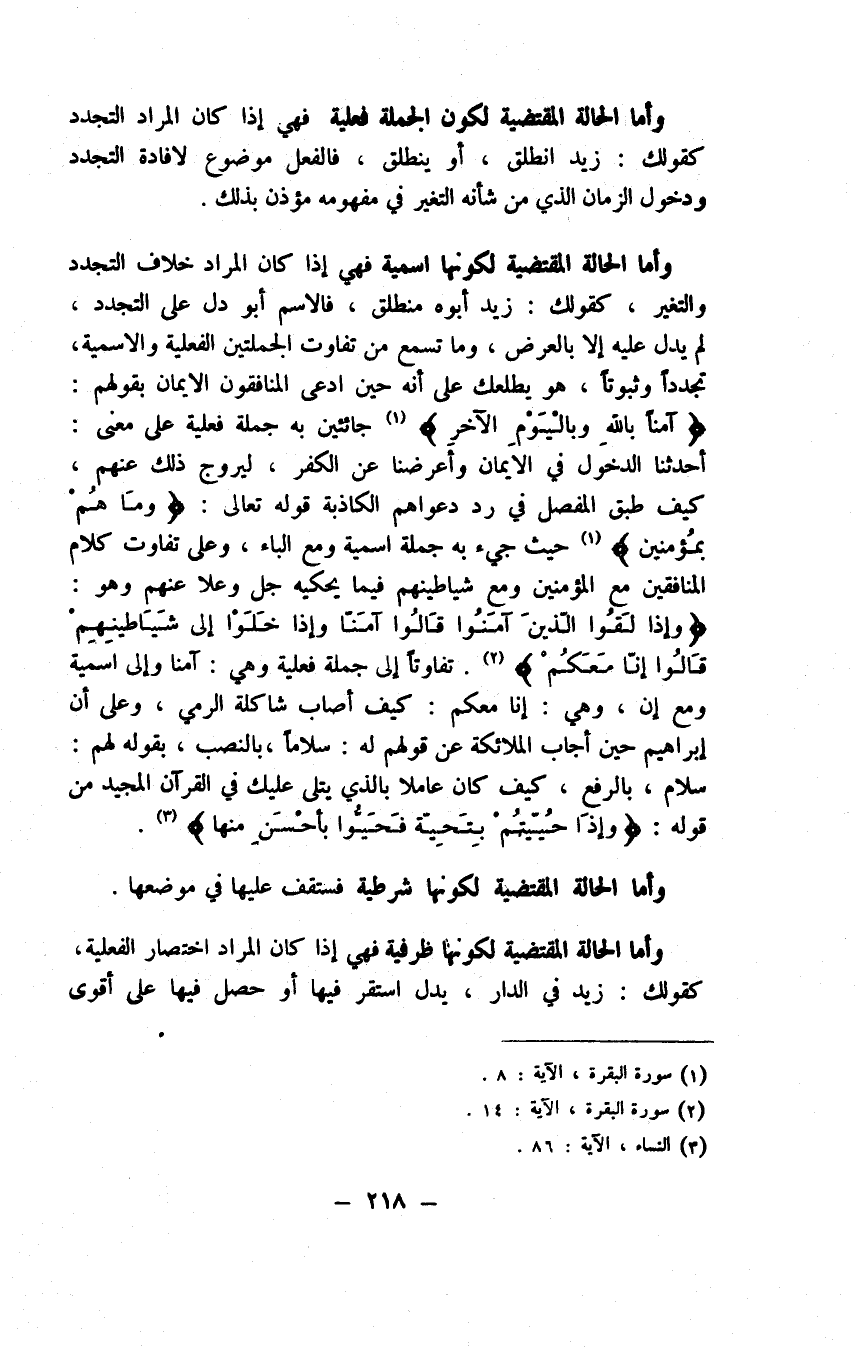ذكره ويكون المطلوب هو الاختصار أو اتباع الاستعمال الوارد على تركه كما إذا أردت ضرب المثل بقولهم لا حظية فلا ألية أو بقولهم لو ذات سوار لطمتني أو غير ذلك مما هو مصبوب في هذا القالب أو على ترك نظائره كما إذا قلت إن زيد جاء ولو عمرو ذهب وتلك القرائن كثيرة وأنا أضبط لك منها ههنا ما تستعين على درك ما عسى يشذ عن الضبط فأقول والله الموفق للصواب: منها أن يكون مفسراً كنحو أن ذو لوثة لأنا ولو ذات سوار لطمتني وهلا أبوك حضر وإذا السماء انشقت ونحو أزيد ذهب أو ذهب به أو ذهب أخوه ونحو وإياي فارهبون كما سبق التعرض له في علم النحو، ومنها ان يكون هناك حرف إضافة فإن حروف الإضافة لوضعها على أن يفضي بمعاني الأفعال على السماء لا تنفك عن الأفعال إلا أن دلالتها لا تتخطى الفعل المطلق فإذا أريد تقييده احتيج على دلالة أخرى ثم هي تتفاوت فتارة يكون الشروع كما إذا قلت عند الشروع في القراءة بسم الله فإنه يفيد أن المراد بسم الله اقرأ أو عند الشروع في القيام أو القعود أو أي فعل كان فإنه يفيد تارة ويكون الاقتران كقولك لمن أعرس: بالرفاء والبنين أو لمن فوض إليك أن تختار إليك الاختيار فإنه يفيد بالرفاء أعرست وإليك يفوض وتارة يكون عموم الاستعمال كنحو في الدار أو في البلد أو في كذا فإنه لا يراد إلا معنى الحصول وتارة يكون غير ذلك من مقيدات الأحوال فقس ومنها أن يكون الكلام جواباً لسؤال واقع نحو أن يسمع منك
