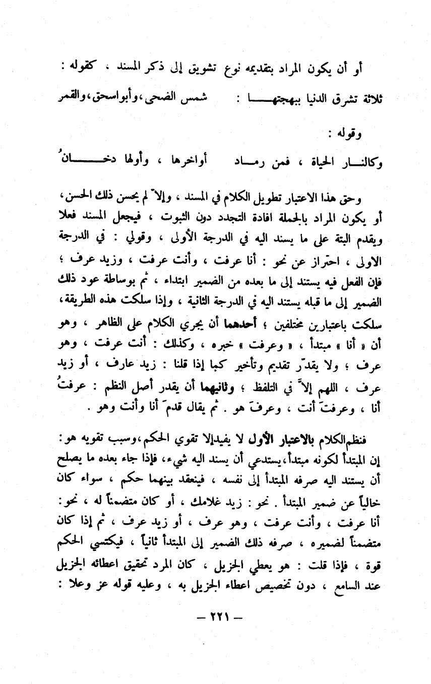 ومنها أن الكلام متى سلك به هذا المسلك لم يكن أوله مطعما في ذكر الكاتب فإذا أورد السامع فائدة ذكره كانت حاله كمن تيسر له غنيمة من حيث لا يحتسب بخلافه في النظم. ومنها أن الكلام على ذلك النظم يكون كالمتناقض من حيث الظاهر لأن كون القرآن مفعولا فضلة فيه يكون مؤذنا بأن مساس الحاجة إليه دون مساس الحاجة إلى الفاعل وكونه مقدماً على الفاعل يكون مؤذنا بالاعتناء بشأنه وأن مساس الحاجة إليه فوق مساس الحاجة على ما أخر بخلافه في هذا النظم فإنه يكون سليما عن ذلك وفي هذا الوجه نظر يذكر في الحواشي، ومنها أن الكلام في التركيب الذي نحن فيه يفيد استنادا الكتبة على الفاعل إجمالا أولا وتفصيلا ثانيا وفي غيره يفيد استنادها إليه من وجه واحد فيكون هذا التركيب أبلغ ومن قبيل ما نحن بصدده وجعلواً لله شركاء الجن فلله شركاءهما مفعولا جعلواً وانتصاب الجن بفعل مضمر دل عليه السؤال المقدر وهو من جعلواً شركاء. وأما الحالة المقتضية لإثبات الفعل فاشتمال المقام على جهة من جهات الاستدعاء له والتلفظ به مما نبهت على أمثالها غير مرة. وأما الحالة المقتضية لتك مفعوله فهو القصد على التعميم والامتناع على أن يقصره السامع على ما يذكر معه دون غيره مع الاختصار وأنه أحد أنواع سحر الكلام حيث يتوصل بتقليل اللفظ على تكثير المعنى كقولهم: في باب المبالغة فلان يعطى ويمنع ويصل