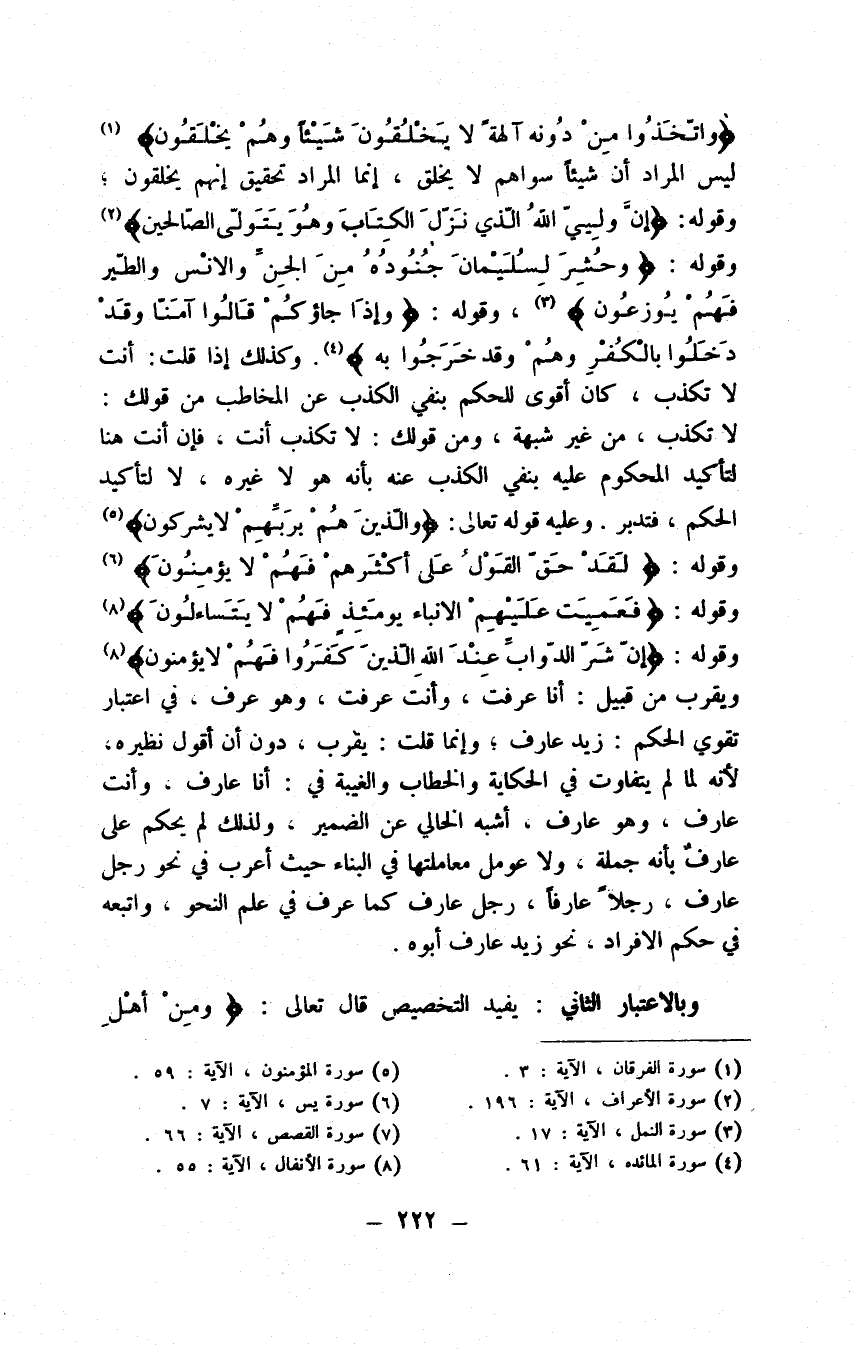 السلام أو القصد على نفس الفعل بتنزيل المتعدي منزلة اللازم ذهابا في نحو فلان يعطي على معنى يفعل الإعطاء ويوجد هذه الحقيقة إيهاما للمبالغة بالطريق المذكور في إفادة اللام للاستغراق، وعليه قوله عز وجل " فلا تجعلواً لله أندادا وأنتم تعلمون " المعنى وأنتم من أهل العلم والمعرفة أو القصد على مجرد الاختصار لنيابة قرائن الأحوال عن ذكره كقوله عز وعلا أهذا الذي بعث الله رسولا إذ لا يلبس أن المراد أهذا الذي بعثه الله لاستدعاء الموصول الراجع إليه من الصلة، وقوله أرني أنظر إليك لاتضاح أن المراد أرني ذاتك، وقوله ولما ورد ماء مدين وجد عليه أمة من الناس يسقون ووجد من دونهم امرأتين تذودان قال ما خطبكما قالتا لا نسقي حتى يصدر الرعاء لانصباب الكلام على إرادة يسقون مواشيهم وتذودان غنمهما ولا نسقي غنمنا حتى يصدر الرعاء مواشيهم وقوله " ولو شاء لهداكم أجمعين " لظهور أن المراد لو شاء هدايتكم لهداكم ولك أن تنظم قوله " فلا تجعلواً لله أندادا وأنتم تعلمون " في هذا السلك على تقدير وأنتم تعلمون أنه لا يماثل أو أنتم تعلمون ما بينه وبينها من التفاوت أو أنتم تعلمون أنها لا تفعل مثل أفعاله كقوله: هل نم شركائكم من يفعل من ذلكم من شيء وأكثر فواصل القرآن من نحو يعلمون يعقلون يفقهون واردة على ما سمعت من الاحتمالين، وقول الشاعر: