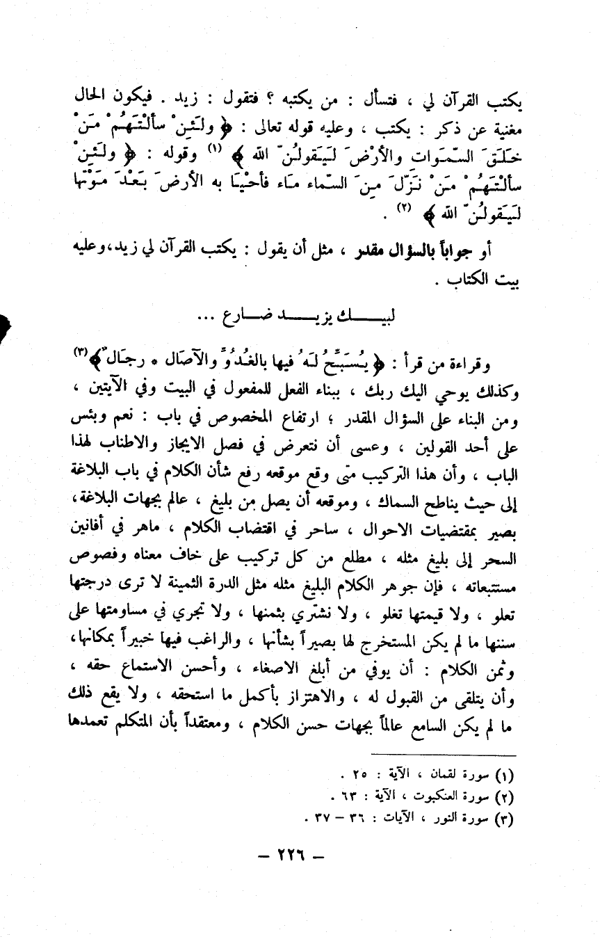 وتقديمك ضميرك وإيلاؤه حرف النفي يقتضي نفي أن تكون ضربته ولا يحترز أن يقال ما ضربت إلا وما ضربت أنا إلا زيداً. وأما الحالة المقتضية للنوع الثاني أن يكون هناك من اعتقد أنك عرفت إنسانا وأصاب لكن أخطأ فاعتقد ذلك الإنسان غير زيد وأنت تقصد رده على الصواب فنقول عرفت وإذا قصدت التأكيد والتقرير قلت عرفت لا غيره ولذلك نهوا أن يقال ما ضربت ولا أحدا من الناس نهيهم أن يقال ما أنا ضربت ولا أحد غيري والنهي الواقع مقصور على الحالة المذكورة أما إذا ظن بك القائل ظنا فاسدا أنك تعتقده قد ضرب عمراً أو أنك تعتقد كون زيد مضروبا لغيره ثم قال لك مدعيا في الصورة الأولى ضربت وفي الثانية أنا ضربت فيصح منك أن تقول ما ضربت ولا أحدا من الناس أو ما أنت ضربت ولا أحد غيرك فتأمل فالفرق واضح وكذلك امتنعوا أن يقال ما ضربت ولكن أكرمته فتعقب الفعل المنفي بإثبات فعل هو ضده لأن مبني الكلام ليس على أن الخطأ وقع في الضرب فيرد على الصواب في الإكرام وإنما مبناه على أن الخطأ وقع في المضروب حين اعتقد فترده على الصواب أن تقول ولكن عمراً وكذلك إذا قلت بزيد مررت أفاد أن سامعك كان يعتقد مرورك بغير زيد فأزلت عنه الخطأ مخصصا مرورك بزيد دون غيره والتخصيص لازم للتقديم ولذلك تسمع أئمة علم المعاني في معنى " إياك نعبد وإياك نستعين " يقولون نخصك بالعبادة لا نعبد غيرك ونخصك بالاستعانة منك لا نستعين أحدا سواك، وفي معنى إن كنتم إياه تعبدون يقولون إن كنتم
