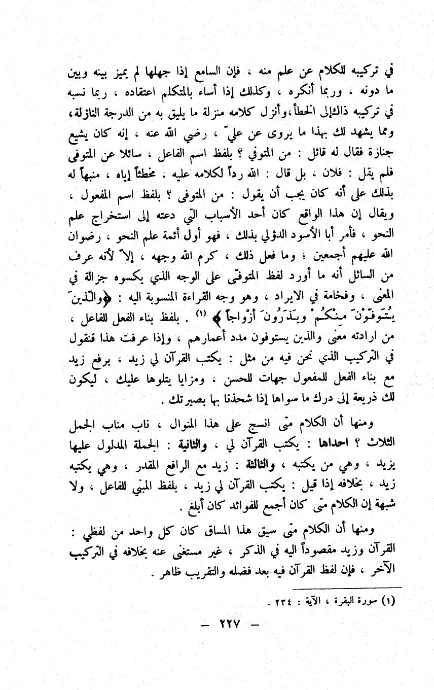 وفي معنى قوله " وبالآخرة هم يوقنون " نذهب على أنه تعريض بأن الآخرة التي عليها أهل الكتاب فيما يقولون أنها لا يدخل الجنة فيها من كان هودا أو نصارى وأنها لا تمسهم النار فيها إلا أياما معدودات وأن أهل الجنة فيها لا يتلذذون في الجنة إلا بالنسيم والأرواح العبقة والسماع اللذيذ ليست بالآخرة وإيقانهم بمثلها ليس من الإيقان بالتي هي الآخرة عند الله في شيء وستعرف التعريض إن شاء الله تعالى في علم البيان، وفي قوله تعالى " لتكونوا شهداء على الناس ويكون الرسول عليكم شهيدا " يقولون أخرت صلة الشهادة أولا وقدمت ثانيا لأن الغرض في الأول إثبات شهادتهم على الأمم وفي الآخر اختصاصهم بكون الرسول شهيدا عليهم وفي قوله تعالى " لعلى الله تحشرون " يقولون إليه على غيره وتراهم في قوله تعالى " وأرسلناك للناس رسولا " يحملون تعريف الناس على الاستغراق ويقولون المعنى لجميع الناس رسولا وهم العرب والعجم لا للعرب وحدهم دون أن يحملوه على تعريف العهد أو تعريف الجنس لئلا يلزم من الأول اختصاصه ببعض الأنس لوقوعه في مقابلة كلهم ومن الثاني اختصاصه بالأنس دون الجن ولإفادة التقديم عندهم التخصيص تراهم يفرعون على التقديم ما يفرعون على نفس التخصيص فكما إذا قيل ما ضربت أكبر أخويك فيذهبون على أنه ينبغي أن يكون ضاربا للأصغر بدليل الخطاب يذهبون أيضا إذا قيل ما ضربت على أنه ينبغي أن يكون ضاربا لإنسان سواه ولذلك يمتنعون أن يقال ما ضربت ولا أحدا من الناس