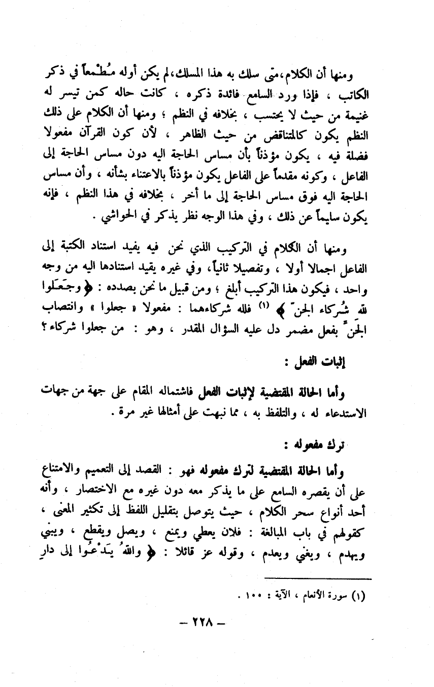 وفي نحو إذا خلوت قرأت القرآن مقام أقرأ القرآن إذا خلوت ولا أقرأ إذا لم أخل لما عرفت أن حالة التقديم هو أن ترى سامعك يعتقد وقوع فعل وهو مصيب في ذلك لكنه مخطئ في الفاعل أو المفعول أو غير ذلك من مقيدات الفعل وأنت تقصد رده على الصواب فإذا نفيت من كان اعتقده من الفاعل أو المفعول استدعى المقام غير ذلك فيجتمع لذلك نفيك للنفي مع الإثبات لمن سواه، وإذا أثبت غير من كان اعتقده استدعى المقام نفى من اعتقده لكونه خطأ فيجتمع إثباتك للمثبت مع النفي للمنفى ويفيد التقديم في جميع ذلك وراء ما سمعت نوع اهتمام بشأن المقدم فعلى المؤمن في نحو بسم الله إذا أراد تقدير الفعل معه أن يؤخر الفعل على نحو بسم الله أقرأ أو أكتب وكأني بك تقول فما بال " اقرأ باسم ربك " مقدم الفعل على المفعول وأن كلام الله أحق برعاية ما يجب رعايته، فالوجه فيه عندي