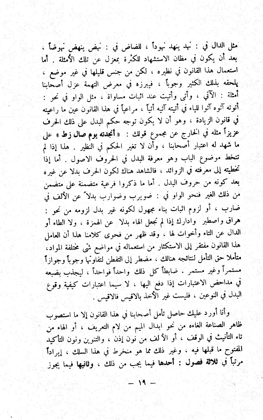 بالفعل أيضاً إذا عرف في أحدهما زيادة فصاحبه لا يصلح للزيادة إلا نادراً كانقحر وا نقحل وانزهو فميم منجنيق أصل إذ عرف ثانيه زائداً بقولهم مجانيق وغير أول الكلمة لا يصلح لزيادة الهمزة والميم في الأغلب فهما في نحو ضئبيل وزئبر وجؤذر وبرأل وتكرفأ وحرمل وعظلم أصل إلا إذا كانت الهمزة طرفا بعد ألف قبلها ثلاثة أحرف فصاعداً خارجة عن احتمال الزيادة فهي زائدة كطرفاء وعاشوراء وبراكاء وبروكاء وجخادباء إلا فيما احتمل أن يكون النصف الثاني منه إذا ألفيت الألف عين النصف الأول كالضوضاء، ويسمى هذا مضاعف الرباعي والآخر من الفعل لا يصلح لزيادة النون فنون تدهقن وتشيطن أصل عند أصحابنا، والأقرب عندي على تجاوب الأصول أن هذا الأصل أكثريّ والنون فيما ذكرنا زائدة وكل واحد من المواضع الأربعة من مضاعف الرباعي لا يصلح للزيادة فليس في نحو وعوع وصيصة زيادة وكذا في نحو قوقيت. والسين لا تكون زائدة في الأسماء غير المتصلة بالأفعال كالميم في الأفعال ونحو تمندل وتمدرع وتمسكن لا اعتداد به فميم تمعدد وتمغفر واسمهر واحرنجم وأمثالها أصل ألبتة. وأما الهاء فقد كان أبو العباس المبرد رحمه الله يخرجها عن الحروف الزوائد، ولولا أني في قيد الاختصار لنصرت قوله بالجواب عما أورد عليه الإمام ابن جني رحمه الله في ذلك ولكن كيفما دارت القصة فالأصل فيها الأصالة فهاء نحو