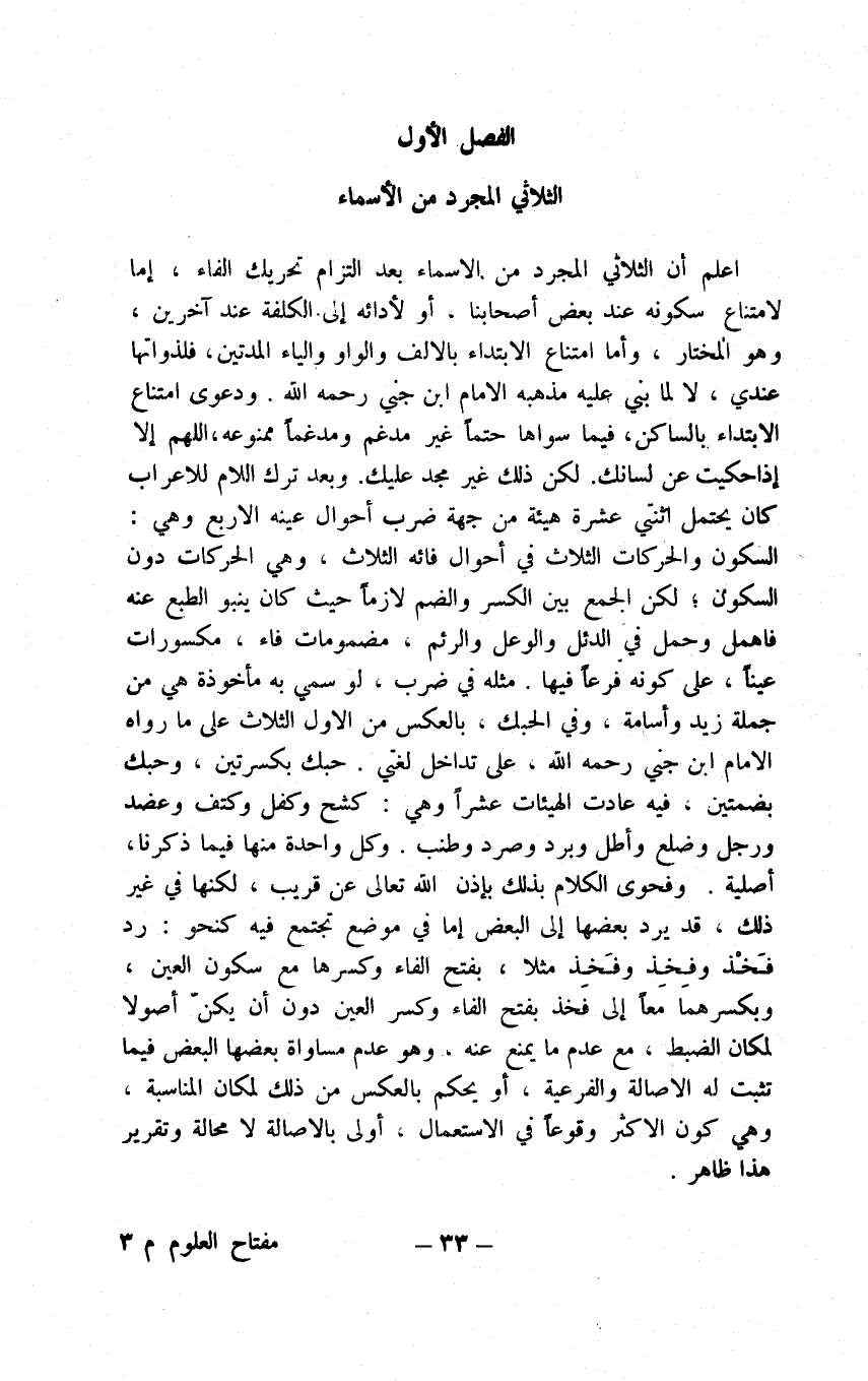 أو علة علة الوضع، وعلى الاحتمالين يلزم مشاركته إياه في الوضع هذا ما يليق بهذا الأصل من التقرير ولنرجع على المقصود ونظير الحيوان والجولان والصورى وأخواتها وكذا دون نحو القود والحركة لمانع أيضا وهو آخر الوجوه وأنه قريب مما تقدم وهو نقض الغرض فيما أريد به من التنبيه على الأصل وفي مساق الحديث في هذا الفصل ما يدل على قول أصحابنا من أن الفعل أصل في الإعلال فتنبه. والنوع الثاني من الإعلال فرع على ما تقدم وهو أن يعل وإن فات شيء من المذكور كفوات تحرك ما قبل المعتل وهو الغالب على هذا النوع أو فوات ما بعد المعتل غير مدة لتفرعه على ما هو أصل في الإعلال وهو الثلاثي من الأفعال المجرد صورة ومعنى نحو قال وباع دون أقال ونحو عور وذلك نحو يخاف وأقام واستقام ومقام بالفتح ومقام بالضم أعلت مع فوات حركة ما قبل المعتل إذ الأصل فيها يخوف وأقوم واستقوم ومقوم ومقوم بسكون ما قبل المعتل كما يظهر لك بإذن الله دون أعين وأدور وأخونه وأعينة وكذا دون نحو أبيض وأسود وما انخرط في سلكها لتفرع الأول على الأسماء والثاني على باب أفعال وتمام الحديث ينبهك على شأنه، وهذا أعني التفرع على الفعل الثابت القدم في الإعلال هو الأصل عندي في دفع ماله مدخل في المنع عنه كسكون ما قبل المعتل من يخاف وأخواته اللهم إلا إذا كان المانع اكتناف الساكنين المعتل كما في نحو أعوار وأعور أيضا وفي تقوال وتسيار وتبيان وتقويم وتعيين ومعوان ومشياط ومخيط أيضا فبابه منقوص عن مفعال وهو مذهب الخليل ونحن عليه وقوال أيضا وبياع