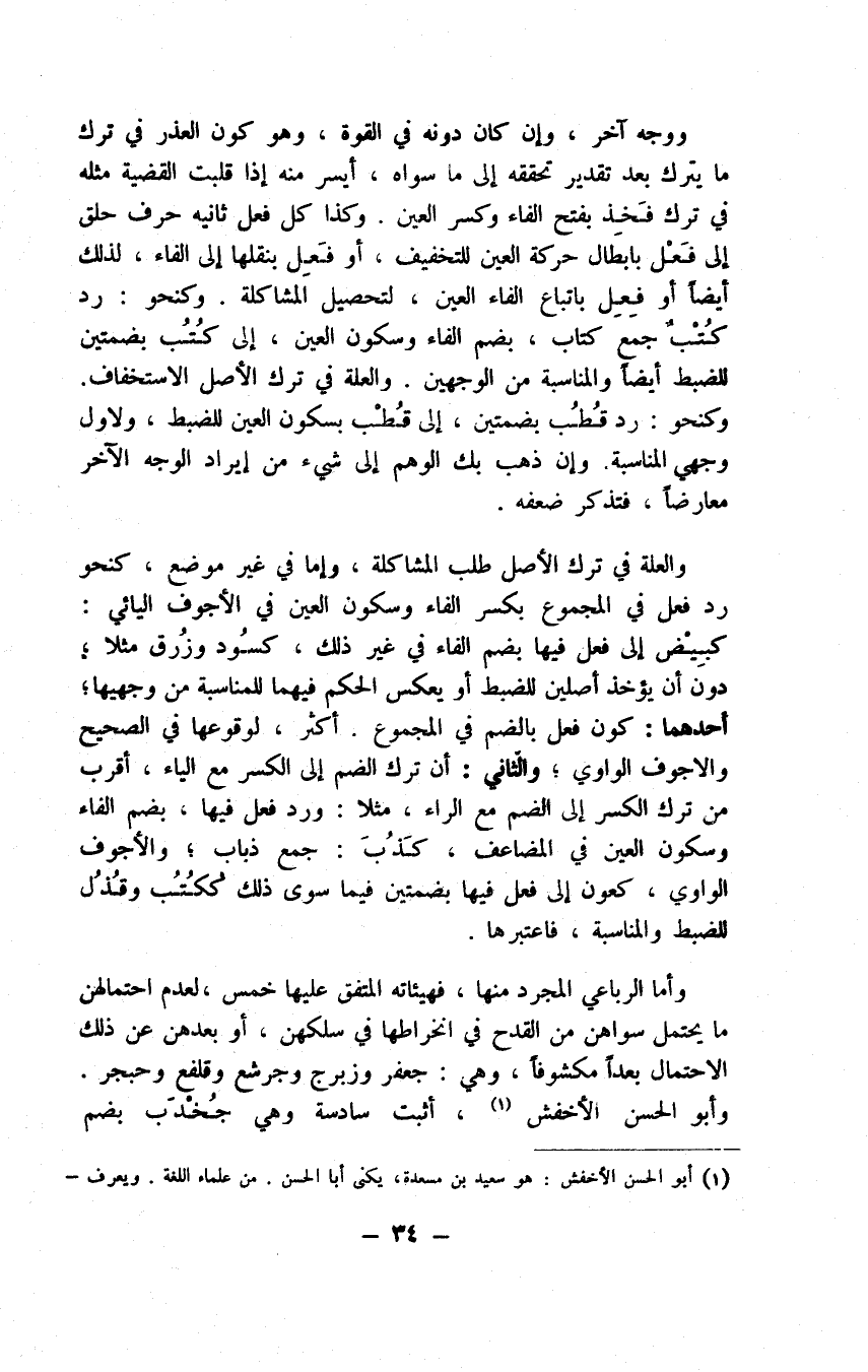 فإنه يحتاج في دفعه على زيادة قوة في الدافع ككون الإعلال في أصول المكتنف نظير الإقامة والاستقامة فستعرف أن الأصل إقوامة واستقوامة والمقول والمبيع من قيل وبيع ومتوارثاً أو كون التصحيح مستثقلا بين الاستثقال كما لو قيل مقوول ومبيوع أو كان المانع امتناع ما قبل المعتل عن التحريك كالألف في قاول وبايع وتقاولوا وتبايعوا فإنه يحتاج في دفعه أيضا على تقوية الدافع كنحو ما وجدت في باب قاول وبايع اسمي فاعلين من قال وباع حتى أعلا فلزم اجتماع ألفين فعدل على همزة وهي تحصيل الفرق بينهما وبين عاور وصايد مثلا اسمي فاعلين من عور وصيد وهذا المعنى قد يلتبس بمعنى التفرع فيعدان شيئاً واحداً فليتأمل أو كان المانع تحصن ما قبل المعتل بالإدغام عن التحريك كنحو ما في جوز وأيد وتجوز وتأيد وقوال وبياع أيضا فلا مدفع له وكذا إذا كان المانع المحافظة على الصورة الإلحاقية كجدول وخروع وعليب أيضا على قول أبي الحسن في جخدب بفتح الدال أو التنبيه على الأصل كما في بابي ما أقوله وهو أقول منه ونحو أغيلت المرأة واستحوذ، وهذا فصل كلام أصحابنا فيه مبسوط وسيحمد الماهر في هذا الفن ما أوردت وبالله الحول وللمتقدم الفضل. ولمضارعه ويدعى غابرا ومستقبلا، وهو ما يعتقب في أوله الزوائد الأربع، وهي الهمزة والنون والتاء والياء مقترنا بزمان الحال أو الاستقبال
