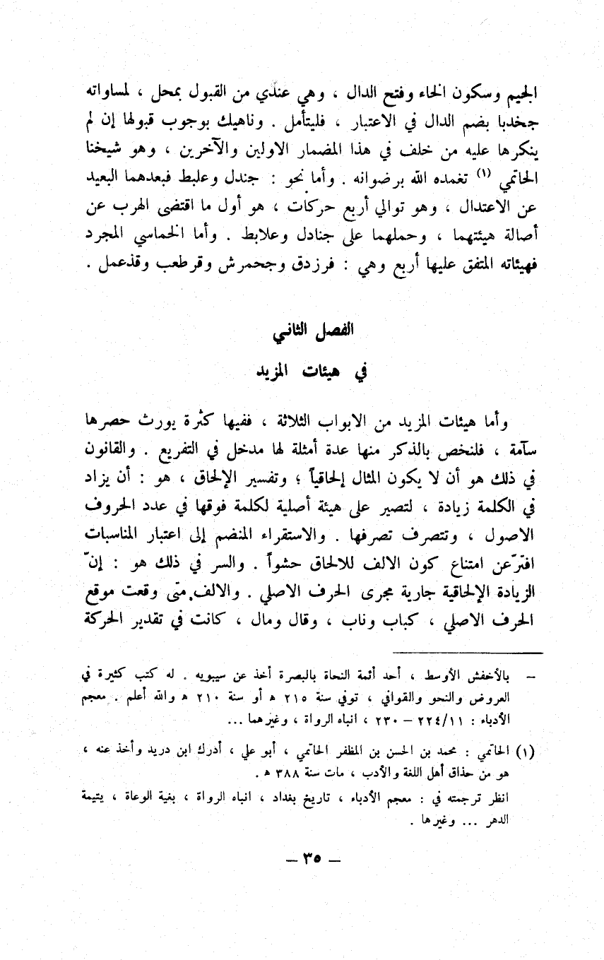 أما المزيد في البابين فنحن نذكر من هيئاته الأصلية ليستعان بها في ذكر بعض الأسماء المتصلة بها دون الفرعية، إذ قلت الفائدة في ذكرها حيث عرفت ما كان المقصود من ذلك ما خلا المبني للمفعول فهو مفتقر إليه وهي أعنى الهيآت الأصلية المستوجبة للتعداد بجملتها إذا تعرضت للزيادة ومواقعها فهن على ما استقر عليه آراء الجمهور من مهارة هذا الفن إحدى وعشرون ست إلحاقيات، وهي فعلل مثل جلبب وفعيل مثل بيطر وفيعل مثل شريف وفوعل مثل جورب وفعول مثل دهور وفعلى مثل سلقى، وأما نحو تجلبب وأخواته واسحكنكك واسلنقى فان اعتبرته ازداد العدد