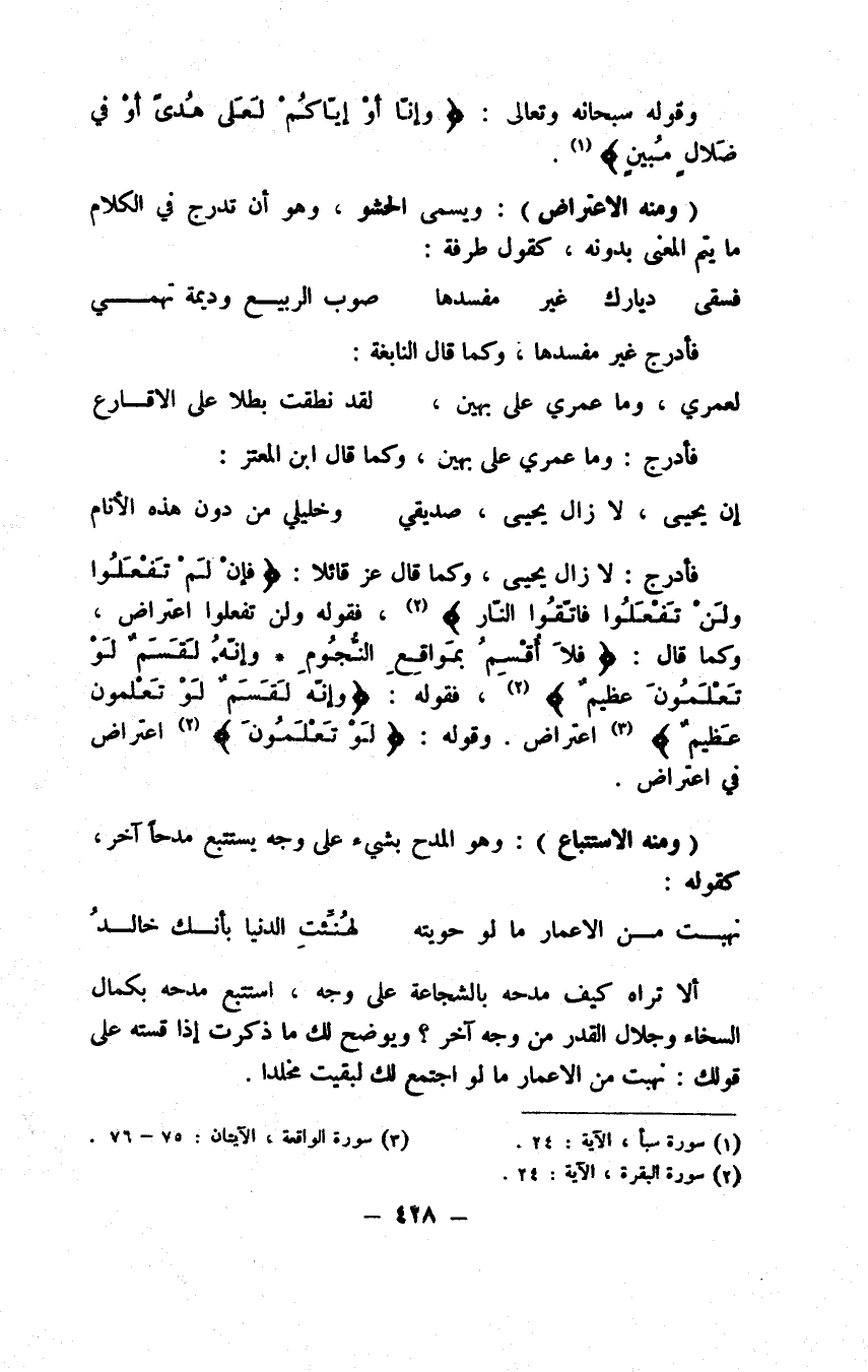 وهي تتبع خوص تراكيب الكلام في الاستدلال ولولا إكمال الحاجة على هذا الجزء من علم المعاني وعظم الانتفاع به لما اقتضانا الرأي أن نرخي عنان القلم فيه علما منا بأن من أتقن أصلا واحداً من علم البيان كأصل التشبيه أو الكناية أو الاستعارة ووقف على كيفية مساقه لتحصيل المطلوب به أطلعه ذلك على كيفية نظم الدليل وكأني بكلامي هذا وأين أنت عن تحققه أعالج من تصديقك به ويقينك لديه بابا مقفلا لا يهجس في ضميرك سوى هاجس دبيبه فعل النفس اليقظي إذا أحست بنبأ من وراء حجاب، لكنا إذا أطلعناك على مقصود الأصحاب من هذا الجزء على التدريج مقررين لما عندنا من الآراء في مظان الاختلاف بين المتقدمين منهم والمتأخرين رجعنا في هذه المقالة بإذن الله تعالى محققين ورفعنا إذ ذاك الحجاب الذي يواري عنك اليقين.
