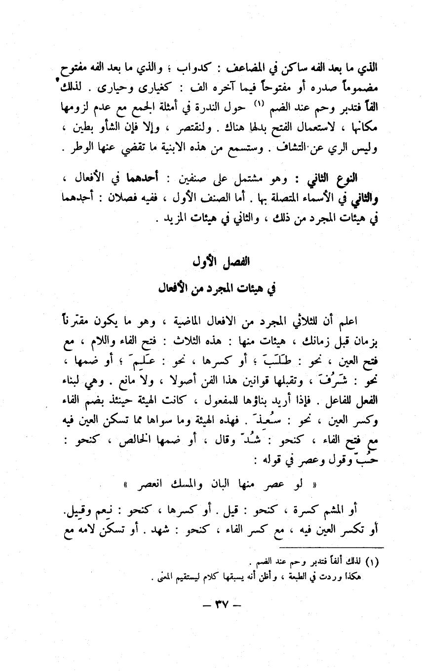المضارعة وفتح العين. الرابعة تفعل يتفعل بفتح الحروف والعين مشددة في البناء للفاعل وللمفعول تفعل بضم التاء والفاء وكسر العين يتفعل بضم حرف المضارعة وفتح البواقي. الخامسة تفاعل يتفاعل بفتح الحروف في البناء للفاعل وللمفعول تفوعل بضم التاء والفاء وانقلاب الألف واوا مدة وكسر العين يتفاعل بضم حرف المضارعة وفتح البواقي. السادسة انفعل بسكون النون بعد همزة مكسورة وفتح البواقي ينفعل بسكون النون وفتح ما يكتنفانه وكسر العين في البناء للفاعل وللمفعول انفعل بضم الهمزة والفاء وسكون النون وكسر العين ينفعل بضم حرف المضارعة وسكون النون وفتح ما بقي. السابعة افتعل يفتعل وافتعل يفتعل على نحو الهيئة السابقة حركة وسكونا وفي البناءين. الثامنة استفعل بسكون الفاء والسين بعد همزة مكسورة وفتح ماعدا ذلك يستفعل بسكون السين والفاء وكسر العين وفتح ما سوى ذلك في البناء للفاعل وللمفعول استفعل بضم ما يكتنفان السين وكسر العين يستفعل بضم حرف المضارعة وفتح ما كان مكسورا. التاسعة افعوعل يفعوعل وافعوعل يفعوعل على نحو الهيئة الثامنة سواء بسواء في البناءين. العاشرة افعول يفعول وافعول يفعول كذلك. الحادية عشرة افعال بسكون الفاء بعد همزة مكسورة وتثقيل اللام بعد ألف يفعال بوضع حرف المضارعة مفتوحا موضع الهمزة وتبقية الباقي بحاله في البناء للفاعل وللمفعول افعوعل بضم الهمزة وقلب الألف واوا مدة يفعال بضم ما كان مفتوحا منه. الثانية عشرة افعل يفعل وأفعل يفعل بحذف المدة فحسب هذه هيئات مزيد الثلاثي وما بقي فهيئات مزيد الرباعي وهي ثلاث. الأولى تفعلل يتفعلل نحو تدحرج يتدحرج بسكون العين وفتح الباقي في البناء للفاعل وللمفعول تفعلل بضم التاء والفاء وسكون