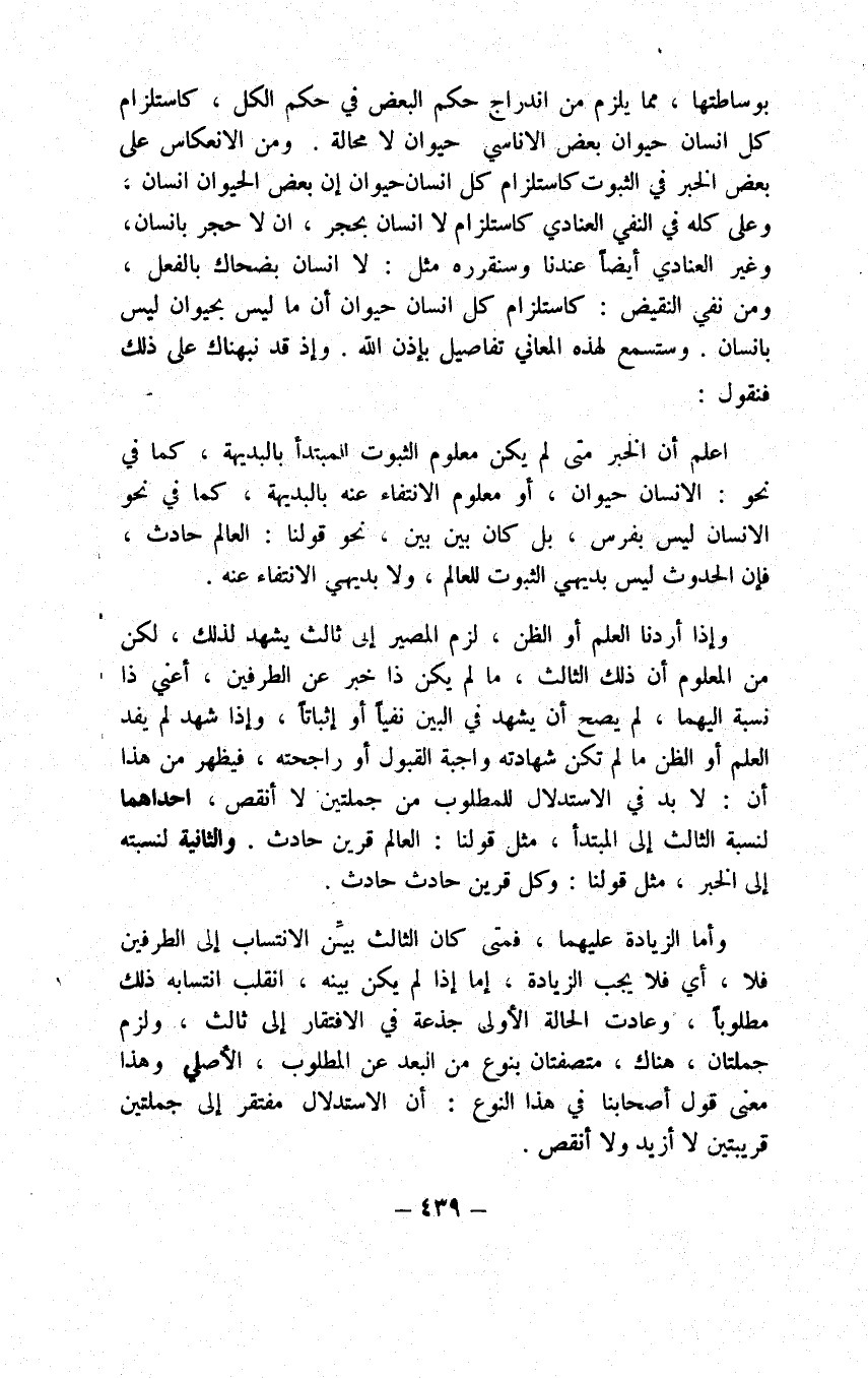 لا تعرى عن كلية لأن السابقة واللاحقة متى كانتا بعضيتين احتمل البعضان التغاير ولم يلزم اتحاد المبتدأين فلا يتحقق لخبريهما اجتماع وتركيب الدليل في هذه الصورة لا يزيد على ستة أضرب: أحدها سابقة مثبتة كلية ولاحقة مثلها. وثانيها سابقة مثبتة بعضية ولاحقة مثبتة كلية. وثالثها سابقة مثبتة كلية ولاحقة مثبتة بعضية، والحاصل في هذه الثلاثة ثبوت بعضي مثال الأول كل إنسان حيوان وكل إنسان ناطق يلزم بعض الحيوان الناطق ومثال الثاني بعض الناس قصير وكل إنسان ضحاك يلزم بعض القصار ضحاك ومثال الثالث كل إنسان حيوان وبعض الناس كاتب يلزم بعض الحيوان كاتب. ورابعها سابقة مثبتة كلية ولاحقة منفية كلية. وخامسها سابقة مثبتة بعضية ولاحقة منفية كلية. وسادسها سابقة مثبتة كلية ولاحقة منفية بعضية، والحاصل في هذه الثلاثة نفي بعض مثال الرابع كل إنسان حيوان ولا إنسان بفرس يلزم بعض الحيوان ليس بفرس ومثال الخامس بعض الحيوان أبيض ولا حيوان بحجر يلزم بعض الأبيض ليس بحجر ومثال السادس كل إنسان ناطق وبعض الناس ليس بكاتب يلزم بعض الناطق ليس بكاتب والسبب في أن كانت ضروب تأليفات هذه الصورة ستة هو أن وجوب كون السابقة مثبتة أهمل ثمانية والتزام أن لا تعرى عن كلية أهمل اثنين. وأما الصورة الرابعة فيجعل الثالث فيها لازما في اللاحقة كلية أو بعضية كيف كانت لمبتداها الذي هو خبر المطلوب فيصير بعضه مستلزما لخبر المطلوب استلزاما بحكم الانعكاس ويجعل كله في السابقة ليشمل البعض المستلزم لخبر المطلوب ملزوما لخبرها الذي هو مبتدأ المطلوب فيصير مستلزما لبعض مبتدأ المطلوب وهو القدر الذي يصح انعكاسه عليه ويجمع بين جزأي المطلوب في الضربين جمعا بعضيا وإلا لزم القدح في أحد الاستلزامين ويلزم الجمع بين النقيضين مثال الأول كل إنسان حيوان وكل ناطق إنسان يلزم منه بعض الحيوان ناطق ومثال الضرب الثاني كل إنسان ناطق وبعض السود إنسان يلزم منه بعض الناطق أسود أو يجعل الثالث في اللاحقة معاندا لكل مبتدأها فينعقد العناد بينهما كليا من الجانبين ويجعل كله أو بعضه كيف كان ملزوما لخبر السابقة فيصير مستلزما لبعض الخبر الذي هو مبتدأ المطلوب ومعاندا لكل خبر المطلوب ويفرق بين الخبرين تفريقا بعضيا وإلا لزم القدح في كونه مستلزما معاندا ويلزم الجمع بين النقيضين مثال الضرب الأول منهما كل إنسان حيوان ولا شيء من الأفراس بإنسان يلزم منه لا كل حيوان فرس ومثال الضرب الثاني منهما بعض الحيوانات أبيض ولا شيء من الحجر بحيوان يلزم منه لأكل أبيض حجر أو يجعل الثالث لازما في اللاحقة كلية مستلزما بعضه لكل مبتدئها ويجعل مباينا في السابقة كليا فيصير مباينا لكل مبتدأ المطلوب مستلزما لكل خبره ويفرق بينهما تفريقا كليا وإلا لزم القدح في كونه مباينا مستلزما ويلزم الجمع بين النقيضين والذي صير ضروب هذه الصورة الستة عشر على خمسة التفصيل المذكور وهو كلية السابقة مثبتة في الإثبات وكليتها منفية في النفي مع كلية اللاحقة وكلية اللاحقة منفية والسابقة كيف كانت. تعرى عن كلية لأن السابقة واللاحقة متى كانتا بعضيتين احتمل البعضان التغاير ولم يلزم اتحاد المبتدأين فلا يتحقق لخبريهما اجتماع