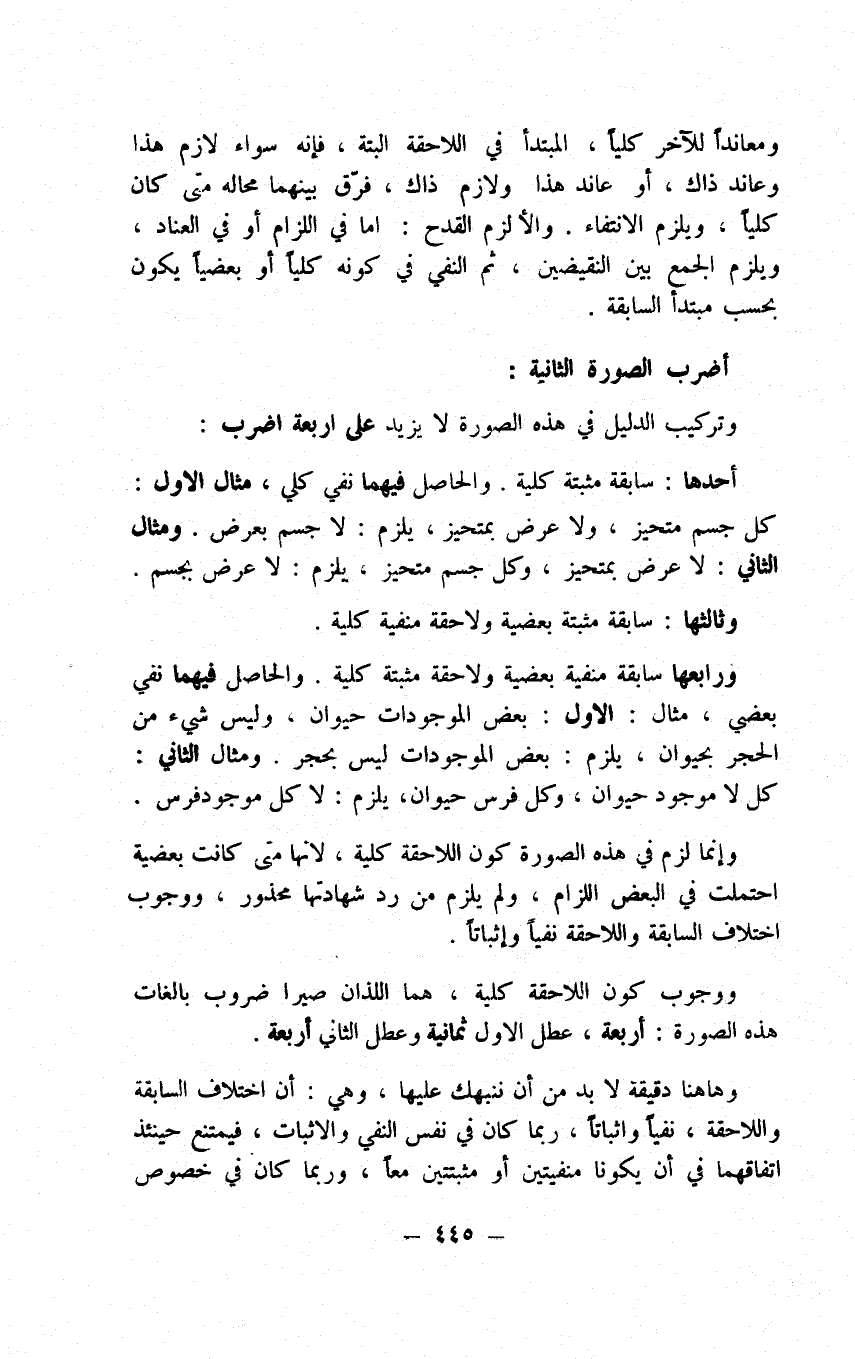 أسود لأن قولنا الأسود جامع للبصر: معناه الشيء الذي له السواد: ورابعها أن لا تختلفا فيه أيضا اختلافهما في نحو الأب حاضر: أي أبو زيد، الأب ليس بحاضر. أي أبو عمرو. وخامسها أن لا تختلفا فيه هوية اختلافهما في نحو بعض الناس كاتب: أي هذا، بعض الناس ليس بكاتب: أي ذاك، وينوب عندي عن هذه الخمسة حرف واحد، وهو اتحاد المبتدأ وأنه أحوط إذا تأملت. وسادسها أن لا تختلفا في الخبر معنى اختلافهما في نحو زيد مختار إذا أردت اسم الفاعل زيد ليس بمختار إذا أردت اسم المفعول. وسابعها أن لا تختلفا فيه قوة وفعلا اختلافهما في نحو الخمر في الدن مسكر: أي بالقوة: الخمر فيه ليس بمسكر: أي بالفعل. وثامنها أن لا تختلفا فيه إضافة اختلافهما في نحو العشرة نصف: أي نصف العشرين، العشرة ليست بنصف: أي نصف الثلاثين. وتاسعها أن لا تختلفا فيه نسبة على المكان اختلافهما في نحو زيد كاتب: أي في المسجد زيد ليس بكاتب: أي في السوق. وعاشرها أن لا تختلفا فيه نسبة على الزمان اختلافهما في نحو زيد كتب: أي أمس، زيد ما كتب: أي غدا. ومن اتحاد المبتدأ واتحاد الخبر يطلع على معنى قولي أقل مما يذكر ولما ترى من توقف التناقض من أمس، وينوب عن هذه الخمسة أيضا ما هو أجمع للغرض وهو اتحاد الخبر وما ذكرت على اتحاد المحكوم له، وهو المثبت له أو المنفي عنه،