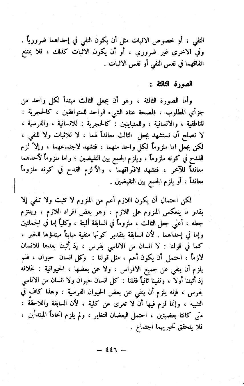 وعلى اتحاد المحكوم به، وهو المتثبت أو المنفي ليتحد مورد الحكم في الإثبات والنفي حتى يتعين فيه أحدهما لعدم الواسطة بين الثبوت والانتفاء لا يخفى عليك حال أصناف الجمل التي سبق ذكرها، وهي صنف المهملات، وصنف المعنيات، وصنف الكليات، وصنف البعضيات في باب التناقض من أن البعضيات لا سبيل على تناقضها لتعذر إزالة اختلافهما بالهوية مع كونها بعضيات: أعني غير معنيات، وأما المعينات والكليات فلها سبيل على التناقض للطريق الميسر على تحصيل اتحاد المحكوم له فيها وتحصيل اتحاد المحكوم به. أما اتحاد المحكوم له في المعينات فلا خفاء، وأما اتحاده في الكليات فالطريق على تحصيله وضع اللاكل في مقابلة الكل كقولنا: كل إنسان كاتب لا كل إنسان كاتب، وإن شئت بعض الناس ليس بكاتب أو إنسان ما ليس بكاتب لا تتفاوت ثلاثتها في معنى اللاكل إذا تأملت، ووجه حصول الاتحاد بذلك هو أن قولنا: كل إنسان كاتب معناه كل واحد واحد من الأناسي لا الكل المجتمع وقولنا إنسان كاتب معناه كل واحد ما من غير اشتراط الانفراد فهو داخل في كل واحد واحد وأنه أحدم، آحاد الأناسي. وأما تحصيل الاتحاد في المحكوم به فالطريق إليه فيما سوى الزمان النص عليه كقولنا: زيد كاتب للتورية بالقلم الفلاني بالقرطاس الفلاني للغرض الفلاني وما شاكل ذلك من القيود الفادحة في التناقض بسبب التفاوت فيها، ومن هذا يطلع على معنى قولي شروط التناقض أكثر مما يذكر، وأما الزمان فبتقدير تعذر الطريق على تعيين جزء من أجزائه يصنع نظير ما سبق بوضع الدوام في أحد الجانبين مرادا به كل واحد واحد من أجزاء الزمان بالاعتبار المذكور واللادوام في الجانب