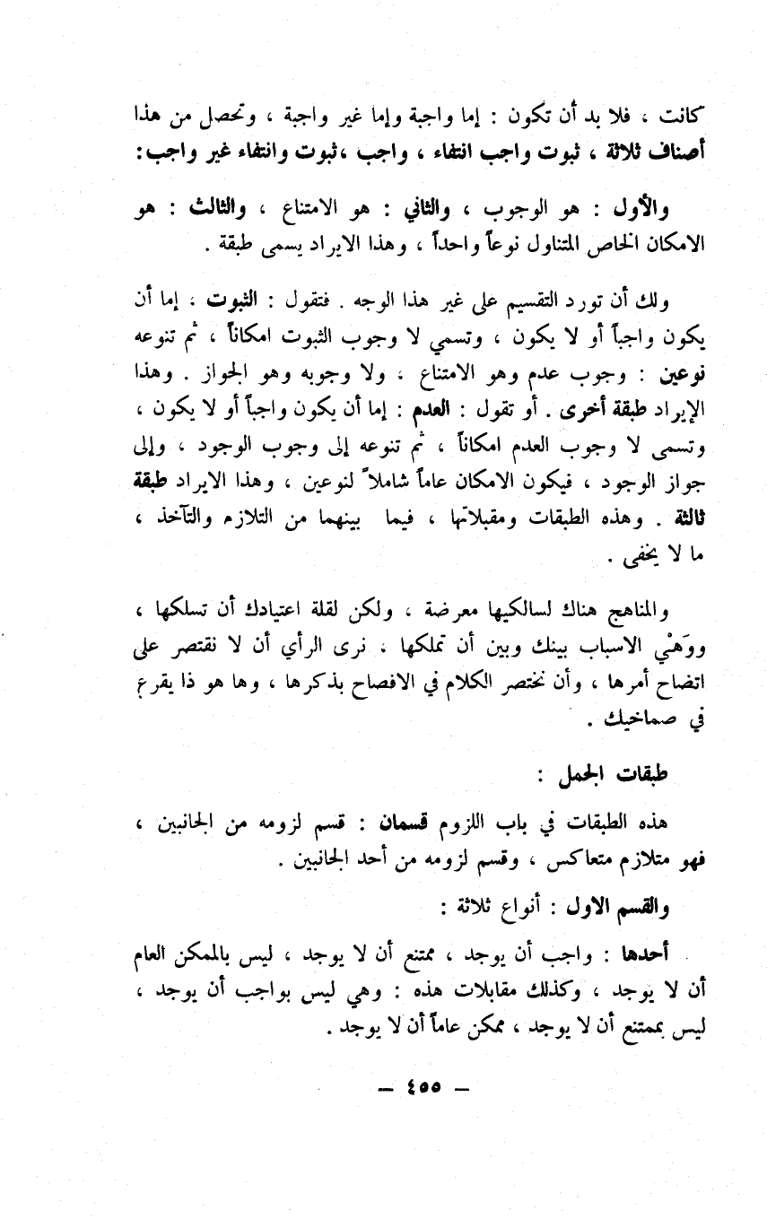 الضرورة وهذه تتعرض لنفيها ثم إذا قيدتها بعام وبخاص وبأخص الأخص وهو الإمكان الاستقبالي على ما عرفناك حصلت من مجموع ذلك خمسة أنواع للجمل كما ترى وإذ قد حصلنا من الجمل القدر المحتاج إليه لزم أن نفي بالوعد في تحقيق النقائض فنقول: أما البعضيان فقد عرفت أن لا سبيل على تناقضهما لتعذر الطريق على اتحاد المحكوم له فيهما باحتمال تغابر هو بين المبتدأين، وأما الكليتان فصحة اجتماعهما في الكذب لاحتمال اختصاص الصدق بغيرهما وهو اللاكل تسد الطريق على تناقضهما، وأما المطلقتان العامتان فلا سبيل على تناقضهما لتعذر الطريق على اتحاد المحكوم به فيهما لاحتمالهما للادوام المصير لهما على البعض من الزمان المتعذر الاتحاد باحتمال تغاير هو بين البعضين فحال المطلقتين العامتين من جانب الخبر كحال البعضيتين من جانب المبتدأ فحيث عرفت أن البعضية لا يناقضها إلا الكلية فاعرف أن المطلقة العامة لا يناقضها إلا الدائمة ومن هذا يتحقق أن قول من يقول بصحة تناقض المطلقتين مفتقر على تأويل ولعل المراد المطلقات اللفظية المستتبعة للدوام معنى كقولنا كل إنسان حيوان أو ناطق أو ضحاك وما شاكل ذلك، وأما الوجودية الدائمة وهي كقولنا كل جسم ما دام موجود الذات قابل للعرض فنقيضتها اللادائمة المحتملة للمخالف الدائم وهو المنتفي في جملة الأوقات وللموافق اللادائم وهو المنتفي لا في جملتها، وأما العرفية العامة وهي قولنا كل إنسان حيوان ما دام إنسانا فحين قيد ثبوت الخبر بدوام الوصف وأطلق في جانب حقيقة المبتدأ وقد عرفت أن إطلاق الخبر في حق المطلق له في حكم اللادائم فقد حصل الدوام مع الوصف واللادوام مع الذوات فيلزم في النقض إما نفي الخبر مع الوصف أو اللادوام مع الذات فيلزم في البعض إما نفي الخبر عن حقيقة المبتدأ على الدوام أو نفيه عن الوصف لا على الدوام، وأما