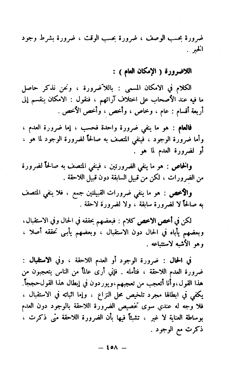 وثانيهما طريق الخلف وحاصله إثبات حقيقة المطلوب ببطلان نقيضه مثل أن يقول إن لم يصدق بعض الحيوان إنسان صدق نقيضه لا شيء من الحيوان بإنسان ويستلزم لا إنسان حيوان وأنه باطل هذا، وعسى أن يكون لنا على حديث الخلف في آخر التكملة عود. وقبل أن نشرع فيما نحن له فاعلم أن المتأخرين قد خالفوا المتقدمين في عدة مواضع من هذا الباب كما ستقف عليها وخطئوهم وكل من يأتي يرى رأي المتأخرين وعندي أن المتقدمين ما أخطئوا هناك، وأنا أذكر ها هنا كلاما كليا ليكون مقدمة لما نحن له فأقول وبالله التوفيق: كل أحد لا يخفى عليه معنى قولنا مع قوله مع ما تراهم يقولون الوجود والعدم لا يجتمعان معا ولا يرتفعان معا ويقولون الملزوم بوصف كونه ملزوما لا يعقل إلا مع اللازم ويقولون إذا انتفى اللازم انتفى معه الملزوم ويقولون اعتبار الذات مع الصفة يغاير اعتبار الذات لا مع الصفة، هذا كله لبيان أن معنى مع العلوم فلا نتخذه محل نزاع ثم نقول ولا يخفى أن معنى مع في تحققه سواء فرض في الذهن أو في الخارج مفتقر على طرفين لا محالة وإذا تحقق امتنع اختصاصه بأحدهما دون الآخر لكن متى صدق على شيء أنه مع آخر تصورا أو غير تصور كيف شئت استلزم لأن يصدق على ذلك الآخر بأنه مع ذلك الشيء بذلك الاعتبار وإذا لزم أن يكون المع حاصلا