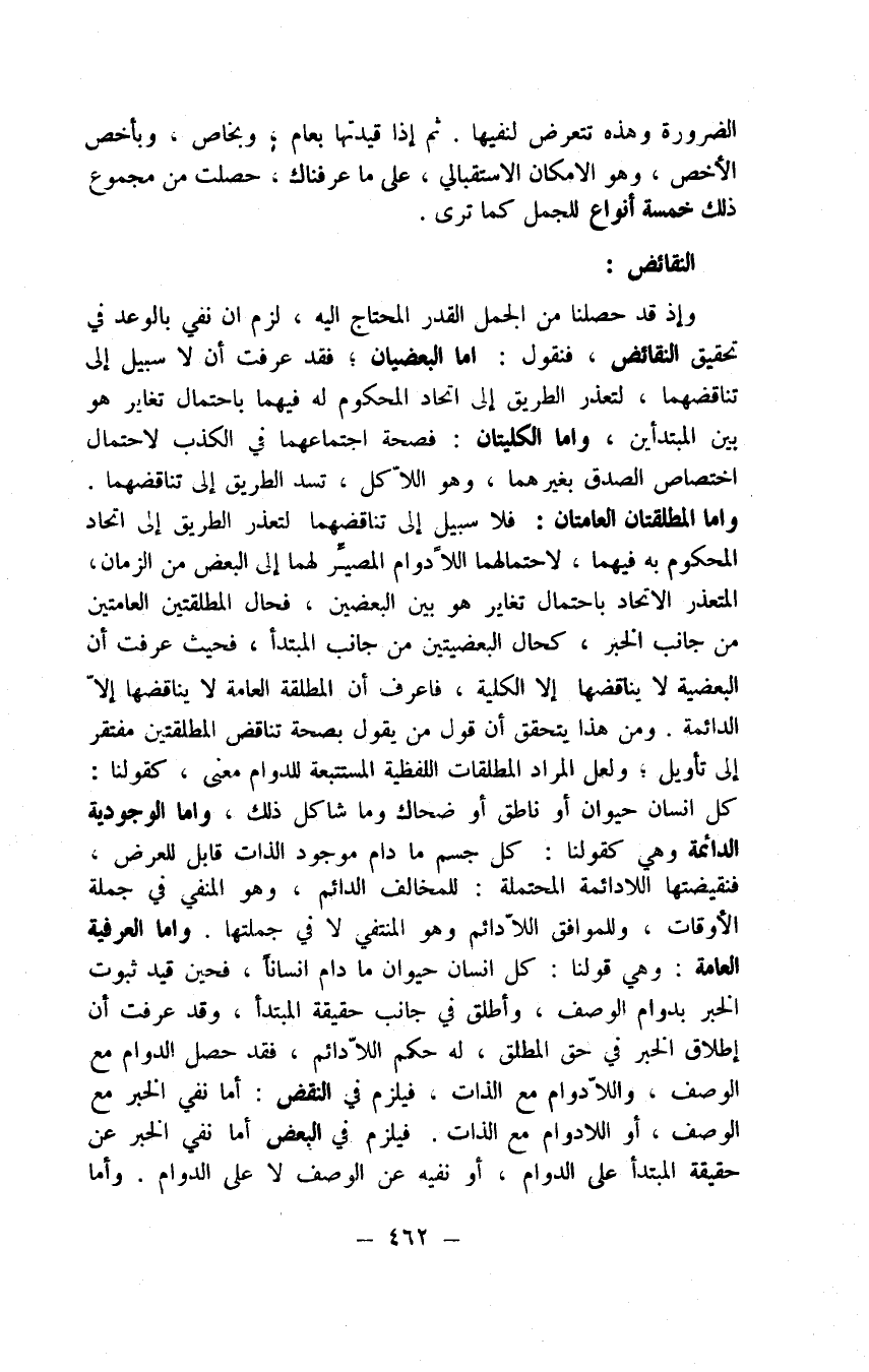 وبيان وجه التغليط في الصورة الثالثة هو أنا متى قلنا بعض الأناسي ضاحك بالإمكان الخاص لم يكن المعنى أن الضاحك لا يجب لإنسان عند فرض وجود ضحك في الدنيا مثلا كالقائم حيث لا يجب لإنسان عند فرض وجود قيام في الدنيا، وإنما المعنى أن الضاحك لا يجب لإنسان بشرط أن لا يفرض وجود للضحك كما لا يفرض له عدم، أما إذا فرض وجود له وجب الضاحك للإنسان لا محالة، وكيف لا يجب والكلام مفروض في أن الضحك خاص بالإنسان، وقولنا أن ضاحكا إنسان لا يرد إلا على فرض وجود الضحك، فالجهتان لا تختلفان إلا لاختلاف فرضي الضحك بالحاصل أن قولنا بعض الأناسي ضاحك بالإمكان الخاص ليس عكسه أن ضاحكا إنسان فإن الضاحك ههنا غير الضاحك هناك فالضاحك هناك غير مأخوذ باعتبار الثبوت له والضاحك هاهنا مأخوذ باعتبار الثبوت له فتأمل ما ذكرت فالمقام ملبس ولأمر ما جرى فيه ما جرى إذ قرع عليه المتأخرون فدونوا ما دونوا وما قصروا في تطبيق التفريعات قدس الله أرواحهم، ولكن الأصل فيه ما فيه وقد سمينا نحن هذا الملبس متعارفا عاميا ويظهر من هذا أن إثبات عكس المنفية البعضية ليس بذلك الممتنع كما يدعيه القوم وإنما أطنبت مع أن عادتي الاختصار لا سيما والأقل من القليل مما ذكرت كان يكفي فإنك في مقامك هذا لا كما تراك من جمعي المتقدمين والمتأخرين بين أطواد وأطواد، وإذ قد ذكرنا ما ذكرنا فلنرجع على المقصود: أما المطلقات العامة فالمثبتة الكلية منها مثل قولنا كل اسم كلمة تنعكس بعضية وبيان انعكاسها إما بالافتراض وهو أنه يمكن الإشارة على واحد
