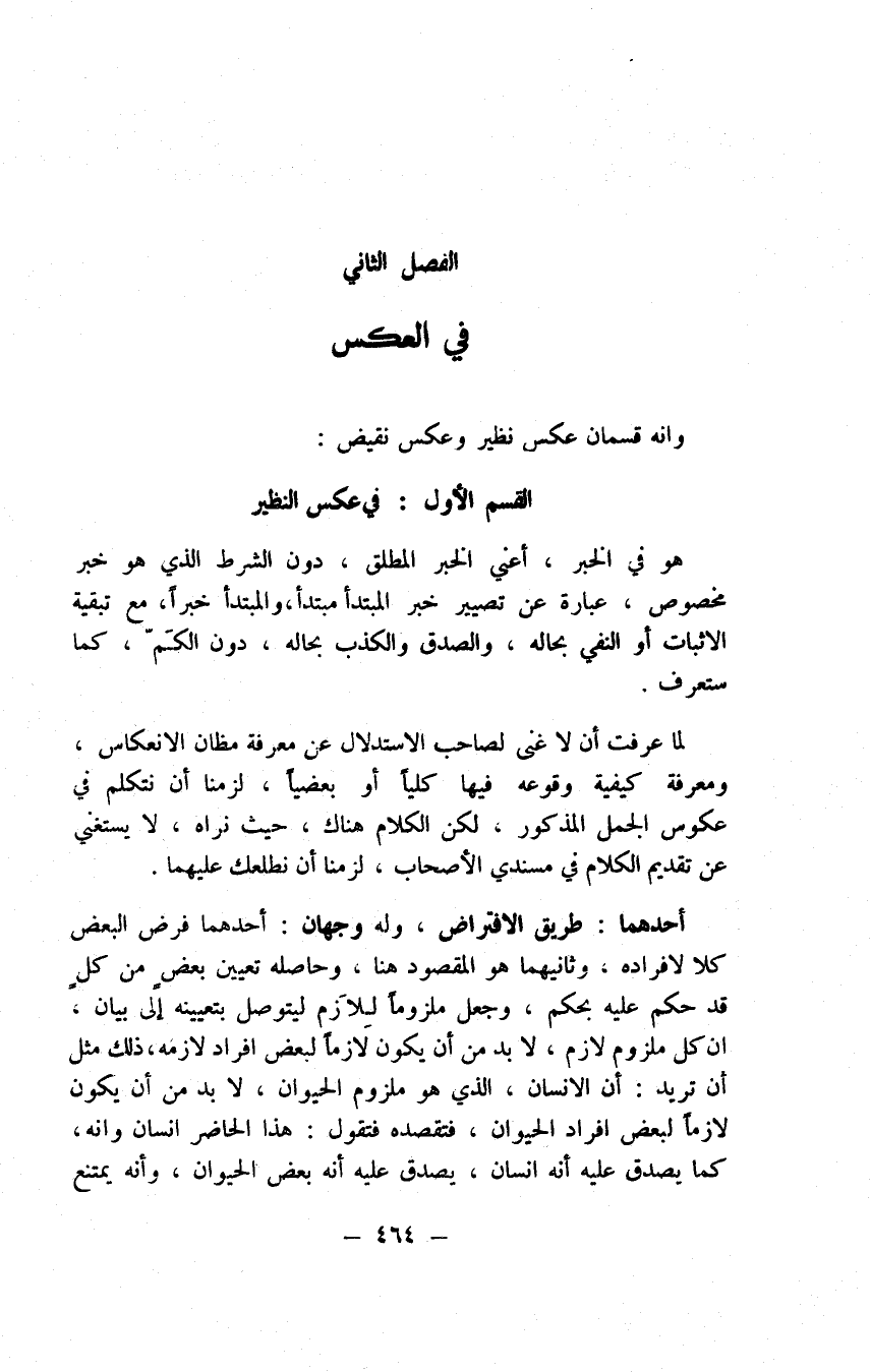 مطلقا عاما، فالقول بأن عكس المطلق العام يجب أن يكون عكسه مطلقا عاما خطأ، لكنا نقول قولكم يصدق كل متحرك جسم بالضرورة ولا يصدق بعض الأجسام متحرك بالضرورة لا يلزم منه أنه إذا لم يصدق بالضرورة أن لا يصدق بغير الضرورة، ونحن إذا بينا صدقه بغير الضرورة ثبت ما نقول من أن المثبتة الكلية إذا صدقت لزم أن يصدق عكسها. نعم يبقى أن يقال بالضرورة تتغير على الاستدلال، لكنا نقول المطلوب من الضرورة في القضايا هو العلم فإذا حصل العلم كان النزاع فيما وراء ذلك نزاعا لا تضايق فيه وبيان صدقها بغير الضرورة هو أنا نقول إذا صدق كل متحرك جسم فصدقه سواء قدر في الذهن أو في الخارج أو فيهما معا لا يصح إلا بأن يكون الجسم مع المتحرك بذلك التقدير وإذا كان الجسم مع المتحرك لزم في بعض المتحرك أن يكون مع الجسم بذلك التقدير وإلا لزم أن يكون المع حاصلا حين لا يكون حاصلا لما سبق من التقرير ومن تحقيق أن مثل قول القائل كل متحرك جسم بالضرورة ويصدق ويكذب بعض الأجسام متحرك بالضرورة قول من باب التغليط وبناء على المتعارف العامي، وأما المنفية الكلية منها فعند المتقدمين تنعكس، وترى جماعة يبنون انعكاسها بتكلف فيقولون: إذا صدق بالإطلاق لا إنسان بكاتب صدق لا كاتب بإنسان بالإطلاق والأصدق نقيضه وهو بعض الكتبة دائما إنسان فذلك البعض كاتب وإنسان دائما وإنسان دائما وكاتب وقد كان لا إنسان بكاتب وهذا خلف، وعند المتأخرين دعوى انعكاسها غير صحيحة أصلا لقولهم يصدق بالإطلاق لا إنسان بضاحك ويكذب بهذا الإطلاق لا ضاحك بإنسان وعندهم أيضا أن الخلف غير مستقيم لما أن قيد الدوام في قولهم بعض الكتبة دائما إنسان ينصرف على الإنسان ويبقى الكاتب مطلقا كما أنه مطلق في الأصل وهو الإنسان بكاتب ولا تناقض بين المطلقتين، وعندهم إذا انعكست لا بد من انقلاب الإطلاق العام على الإمكان العام، ويقولون الإطلاق العام في الإثبات أقوى حالاً من الإمكان العام فيه، ثم إن الضرورية التي هي أقوى في الإثبات من المطلقة العامة فيه تنقلب في الانعكاس عندهم على الإمكان تارة فيرون فيما دون الضرورية بقاءها في الانعكاس على الإطلاق العام خطأ، وأما نحن فعل صحة انعكاسها وعلى أن قدح المتأخرين في الخلف صحيح دون قدحهم في الدعوى، وعندنا أن الجهة لا تتغير ويخيل بيان صحة الدعوى ودفع قدحهم فيها وأن الجهة لا تتغير على المقدمة المذكورة، وأما سائر ما حكينا عنهم فستقف على ما عندنا هنالك شيئاً فشيئاً. مة واسم فبعض الكلم اسم والخلف هو أن تقول بعض الأسماء كلمة فبعض الكلم اسم وإلا فلا شيء من الكلم ما دامت كلمة باسم بحكم النقيض ولا شيء من الأسماء بكلمة بحكم العكس بالطريق المذكور وقد كان بعض الأسماء كلمة هذا خلف، وأما جهة كونهما مطلقتين فعند المتقدمين لا تتغير وعند المتأخرين تتغير على الإمكان العام وعمدتهم في ذلك هو أنهم يقولون المثبتة الضرورية كقولنا كل متحرك جسم بالضرورة لا يجب أن يكون عكسها مطلقا عاما كقولنا بعض الأجسام متحرك بالإطلاق، وإنما يجب أن يكون ممكنا عاما كقولك بعض الأجسام متحرك وبالإمكان العام والممكن العام لا يجب أن يكون موحوداً ثم بعد هذا يقولون فإذا لم يجب في عكس الضرورية الإطلاق، فأولى أن لا يجب في المطلقة العامة فإن أقوى درجات المطلقة العامة هي أن تكون ضرورية لاحتمال المطلق العام إياها ثم إذا كان نفس الضروري لا يجب أن يكون عكسه مطلقا عاما، فالقول بأن عكس المطلق العام يجب أن يكون عكسه مطلقا عاما خطأ، لكنا نقول قولكم يصدق كل متحرك جسم بالضرورة ولا يصدق بعض الأجسام متحرك بالضرورة لا يلزم منه أنه إذا لم يصدق بالضرورة أن لا يصدق بغير الضرورة، ونحن إذا بينا صدقه بغير الضرورة ثبت ما نقول من أن المثبتة الكلية إذا صدقت لزم أن يصدق عكسها. نعم يبقى أن يقال بالضرورة تتغير على الاستدلال، لكنا نقول المطلوب من الضرورة في القضايا هو العلم فإذا حصل العلم كان النزاع فيما وراء ذلك نزاعا لا تضايق فيه وبيان صدقها بغير الضرورة هو أنا نقول إذا صدق كل متحرك جسم فصدقه سواء قدر في الذهن 