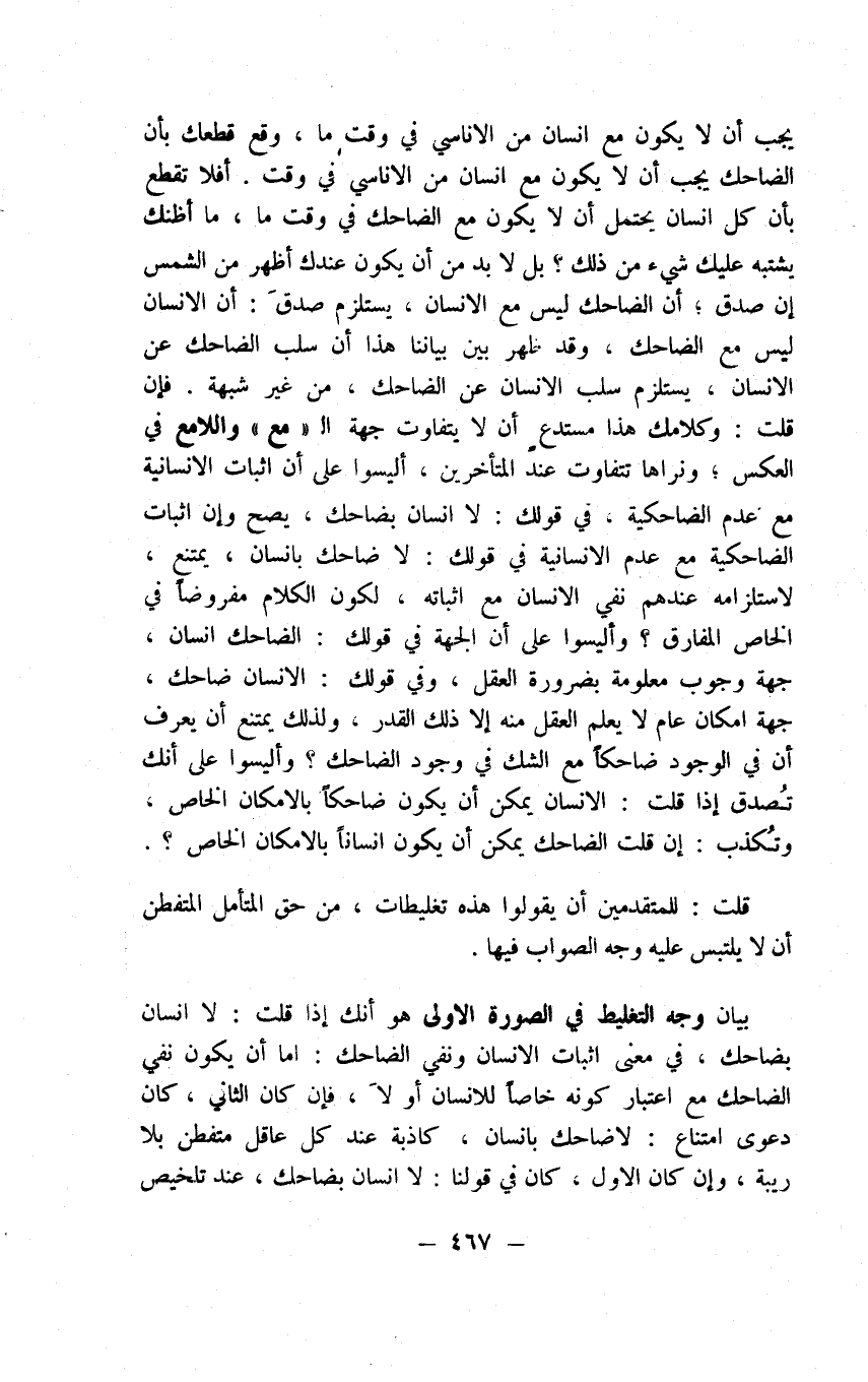 صدق بعض الأفعال حرف على ما سبق من انعكاس البعضية بعضية، ولكن يلزمك في هذا الثاني أن يكون تصحيحك لعكس المثبتة البعضية بغير الخلف لئلا يلزم الدور، وقد منع عن صحة انعكاسها بوجوه منها إن قيل إن قولنا كل إنسان يمكن بالإمكان الخاص أن يكون كاتبا قضية صادقة وكل ما يمكن بالإمكان الخاص أن يكون يمكن أيضا أن لا يكون فأذن كل إنسان يمكن بالإمكان الخاص أن لا يكون كاتبا وكل ما يمكن في وقت يمكن في كل وقت وإلا لزم الانتقال من الإمكان الذاتي على الامتناع الذاتي وهو محال فإذن كل إنسان يمكن أن يكون دائما لا كاتبا وكل ممكن بأنه لا يلزم من فرض وقوعه محال وليفرض صدق قولنا دائما لا إنسان من الناس بكاتب فهذه سالبة دائمة غير ممتنعة مع أن عكسها وهو قولنا لا كاتب واحد بإنسان كاذب فعلمنا أن هذه السالبة لا تنعكس والجواب عندي هو أن ادعاء الكذب لقولنا لا كاتب واحد بإنسان غير صحيح مع الفرض المقدم ذكره وذلك أن كذبه إن كان لم يكن إلا لأن الكتابة لا تنفك عن الإنسان إلا أن دعوى لا انفكاكها عنه، إما أن يكون في الوجود أو في التصور أو فيهما معا لكن ادعاء كذبه في الوجود الخارجي إنما يصح عند فرض وجود كاتب إنسان، لكن صحة فرض وجود الكاتب الإنسان الذي هو عين وجود الإنسان الكاتب مع صحة الفرض المقدم محال فادعاء كذبه في الوجود لا يصح وادعاء كذبه في التصور لا يصح أيضا لأن قولنا دائما لا إنسان من الأناسي بكاتب إن أريد الدوام المتناول لأوقات التصور والوجود استلزم الفرض المقدم فرض تصور الإنسان لا مع الكتابة في جميع أوقات التصور فادعاء كذبه إنما يثبت إذا صح تصور الكاتب للإنسان الذي هو عين تصور الإنسان الكاتب لكن صحة فرض ذلك مع صحة الفرض المقدم محال فادعاء كذبه في التصور لا يصح وإن خصص الدوام بأوقات الوجود الخارجي دون أوقات