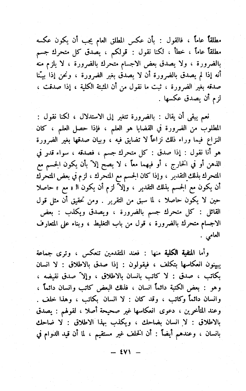 وأما الضروريات بشرط وصف المبتدأ فالمثبتة الكلية منه تنعكس بعضية لكن ممكنة عامة على رأي أكثر المتأخرين للوجه المذكور والرأي عندي انعكاسها ضرورة بالطريق المسلوك في الضرورية المطلقة. وأما المنفية الكلية منها فتنعكس كلية وكنفسها وإلا لزم أن يصدق نقيضها وهو إما الإثبات الدائم أو في بعض الأوقات وأيا كان اجتمع الخبر مع الوصف في وقته ولا يكون النفي ضروريا في جميع أوقات الوصف وكان المفروض ضروريته في جميع أوقاته هذا خلف. وأما الضروريات المشروطة بشرط اللادوام فالمثبتة الكلية منها تنعكس بالاتفاق، وعى رأي أكثر المتأخرين ممكنة عامة، وعلى رأينا ضرورية. وأما المنفية الكلية منه فتنعكس كلية ثم عند المتأخرين مطلقة للحجة التي حكيت عنهم في انعكاس العرفية الخاصة عرفية عامة ونحن إذ دفعنا حجتهم تلك نقول تنعكس كنفسها والضروريتان الوقتيتان أمرهما في الانعكاس في الإثبات وفي النفي على نحو أخواتهما في الضرورة. وأما الممكنات فليس يجب لها في النفي عند المتأخرين عكس لما رأوا أن الشيء قد يصح نفيه عن آخر بالإطلاق ولا يصح نفي ذلك الآخر عن ذلك الشيء بالإطلاق مثل نفي الضاحك عن الإنسان في قولك بالإطلاق لا إنسان بضاحك فإنه يصدق ولا يصح نفي الإنسان عن الضاحك بالإطلاق مثل لا ضاحك بإنسان فإنه يكذب