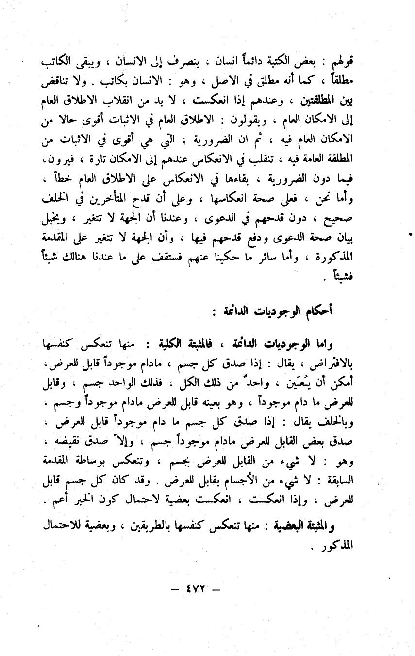 عندهم على ما سبق، وأما في الإثبات فيجب لها عندهم عكس لكن لاحتمال عندهم أن يكون الثبوت بين الشيئين بالإمكان من جانب مثل الجسم متحرك بالإمكان وبالضرورة من جانب آخر مثل المتحرك جسم بالضرورة لا يجعل عكسها ممكنا خاصا بل يجعل عاما ليشمل نوعي الثبوت وإذا صدق الإمكان المطلق ولابد عندهم من أن يكون عاما لأن الأصل وهو بالإمكان كل إنسان صادق أو بعض الناس صادق بأي إمكان شئت يلزم أن يكون عكسه وهو بعض الصادقين إنسان بالإمكان العام وإلا لزم أنه ليس بممكن أن يكون صادق واحد إنسانا ويلزم بالضرورة لا إنسان بصادق، وقد كان كل إنسان صادق أو بعض الناس صادق وهذا خلف وأن جميع ذلك كما ترى على المتعارف العامي، وقد عرفت ما عندنا فيه، ولما تقدم أن العكس يلزم فيه رعاية النفي والإثبات لا يستعملون لفظ العكس حيث لا مراعي ذلك فلا يقولون في مثل بالإمكان الخاص يمكن أن لا يكون كل إنسان كاتبا عكسه بعض الكاتبين إنسان بالإمكان العام كما يقولون في مثل بالإمكان الخاص يمكن أن يكون كل إنسان كاتبا عكسه بعض الكاتبين إنسان بالإمكان العام وقد ظهر أن تفاوت الحمل في العكس إذا وقع لا يقع في الكم وذلك في المثبتة الكلية فحسب.