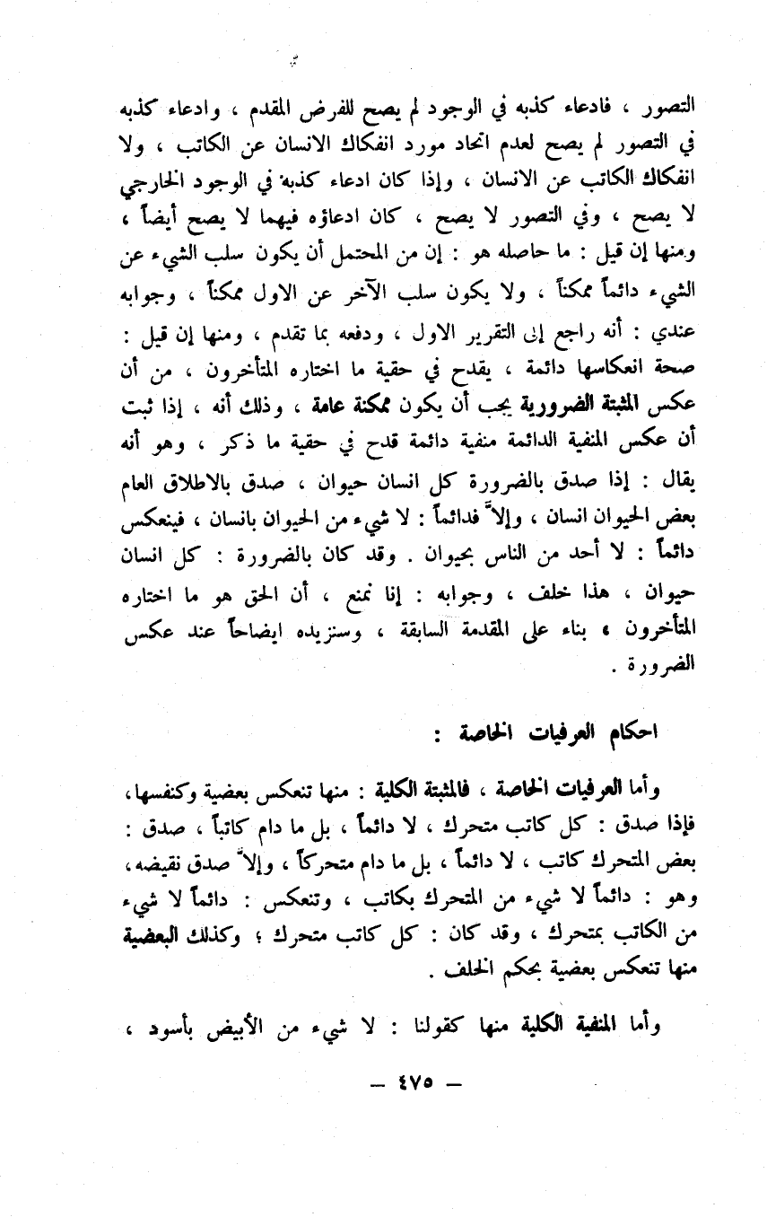 المبنيات بمنصرف ويعرف هذا العمل بذي العكسين بعكس يجري في ضمن الدليل وعكس يجري في الحاصل منه وإن شئت الخلف بالطريقين. قلت فإن كذب لا شيء من المبنيات بمنصرف صدق نقيضه وهو بعض المبنيات منصرف وعندنا كل منصرف معرب فيحصل منهما بعض المبنيات بمعرب فيحصل بعض المنصرف ليس بمعرب وقد كان كل منصرف معرب، وأما الافتراض فكما إذا كان الدليل من الضرب الرابع من الثانية مثل بعض الكلم ليس بمعرب وكل منصرف معرب فبعض الكلم ليس بمنصرف فتفرض البعض المبني من الكلم نوعا وقدره الغايات واجعله