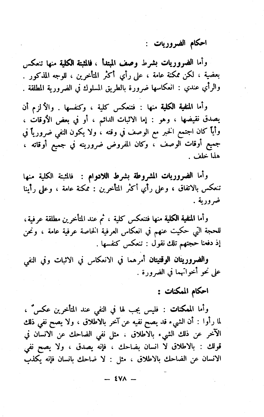 معنى وبعض الألفاظ اسم فبعض الدال على المعنى لفظ تقول بعض الألفاظ اسم وكل اسم دال على معنى فيحصل بعض الألفاظ دال على معنى ثم تعكس الحاصل فيحصل بعض الدال على المعنى لفظ وخلفه على ما عرفناك تقول وإلا فلا شيء من الدال على المعنى بلفظ وتجعله لاحقة لقولك كل اسم دال على المعنى فيحصل لا شيء من الأسماء بلفظ ثم تقول، وعندنا بحكم العكس للاحقة أصل الدليل بعض الأسماء لفظ ويلزم الخلف، وكذا إذا كان من ضربها الثالث مثل كل منصرف معرب ولا شيء من الأفعال بمنصرف فلا كل معرب فعل تعكس الجملتين وأنه من قبيل ذي عكس واحد لبقاء السابقة سابقة واللاحقة لاحقة فتقول بعض المعرب منصرف لا شيء من المنصرف بفعل فيحصل لا كل معرب فعل وقد عرفناك الطرق فاسلكها بنفسك ومتى أتقنت ما ذكر أمكنك تحصيل المطالب بطرق معلومة مضبوطة الأسماء وقد انضم على ذلك ما اخترنا نحن في عكوس الجمل من بقاء جهاتها محفوظة على ما سبق تقرير ذلك ونحن نسوق الكلام على الآخر على أقرب الوجوه في الضبط أمكن ولكن في البين واقع يورث تشويشا فلابد من تداركه وهو أن بين المتقدمين والمتأخرين في الامتزاجات تفاوتا في الحكم يقدح في ضبط الكلام في مواضع ويشوش الأمر على المتعاطين فالرأي أن نطلعك على السبب في وقوع التفاوت ثم نصرح لك بما نحن فاعلوه هناك من اختيار الأقرب على الضبط والعمل بالأليق. ض الألفاظ اسم فبعض الدال على المعنى لفظ تقول بعض الألفاظ اسم وكل اسم دال على معنى فيحصل بعض الألفاظ دال على معنى ثم تعكس الحاصل فيحصل بعض الدال على المعنى لفظ وخلفه على ما عرفناك تقول وإلا فلا شيء من الدال على المعنى بلفظ وتجعله لاحقة لقولك كل اسم دال على المعنى فيحصل لا شيء من الأسماء بلفظ ثم تقول، وعندنا بحكم العكس للاحقة أصل الدليل بعض الأسماء لفظ ويلزم الخلف، وكذا إذا كان من ضربها الثالث مثل كل منصرف معرب ولا شيء من الأفعال بمنصرف فلا كل معرب فعل تعكس الجملتين وأنه من قبيل ذي عكس واحد لبقاء السابقة سابقة واللاحقة لاحقة فتقول بعض المعرب منصرف لا شيء من المنصرف بفعل فيحصل لا كل معرب فعل وقد عرفناك الطرق فاسلكها بنفسك ومتى أتقنت ما ذكر أمكنك