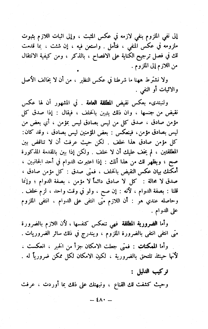 ولاحقة مطلقة عامة مثل ما إذا قلت كل إنسان مادام موجود الذات ضحاك أي له قوة الضحك وكل ضحاك ضاحك بالفعل بالإطلاق، كان الحاصل مطلقا بالاتفاق وهو كل إنسان ضاحك بالفعل وإذا قلبت فجعلت السابقة مطلقة عامة واللاحقة دائمة مثل ما إذا قلت كل إنسان ضاحك بالفعل بالإطلاق، وكل ضاحك بالفعل مادام موجود الذات ضحاك أطلقنا الحاصل ابتداء، ثم ننظر فنرى في اللاحقة الخبر لكونه مقيدا بدوام وجود الذات راجعا على تقييد ذات وجود الموصوف بالدوام دام له الوصف أو لم يدم فننقل الحاصل عن الإطلاق على الدوام أجزاء ونقول اللازم إنسان مادام موجود الذات ضحاك وكلما عرفت هذا في الدائمة يجب أن تعرفه في الضرورية المطلقة بأن تجعل الحاصل مطلقا إذا ركبت الدليل من سابقة ضرورية مطلقة ولاحقة عامة مطلقة مثل قولك الله عز اسمه حي بالضرورة وكل حي مدرك للمدرك بالإطلاق فالله عز اسمه مدرك للمدرك بالإطلاق وإذا قلبت فقلت مثلا الإنسان ضاحك بالفعل بالإطلاق والضاحك بالفعل ضحاك بالضرورة حصل الإطلاق أولا والضرورة ثانيا بالطريق المذكور وإذا ركبته فيها من سابقة ضرورية مطلقة ولاحقة عرفية مثل ما إذا قلت كل جسم بالضرورة متحيز وكل متحيز مادام متحيزا كائن في جهة فلكون اللازم منه وهو الضرورة في الحاصل مساويا في الظهور لأقل ما يلزم وهو الدوام جعلنا الحاصل ضروريا من غير تدريج ويمتنع تركيبه فيها من السابقة الضرورية المطلقة واللاحقة العرفية الخاصة لامتناع اجتماعهما في الصدق فتأمل، وإنما أوصيك لتحريك بعض الأصحاب قلمه هنا بنوع من الاعتراض،