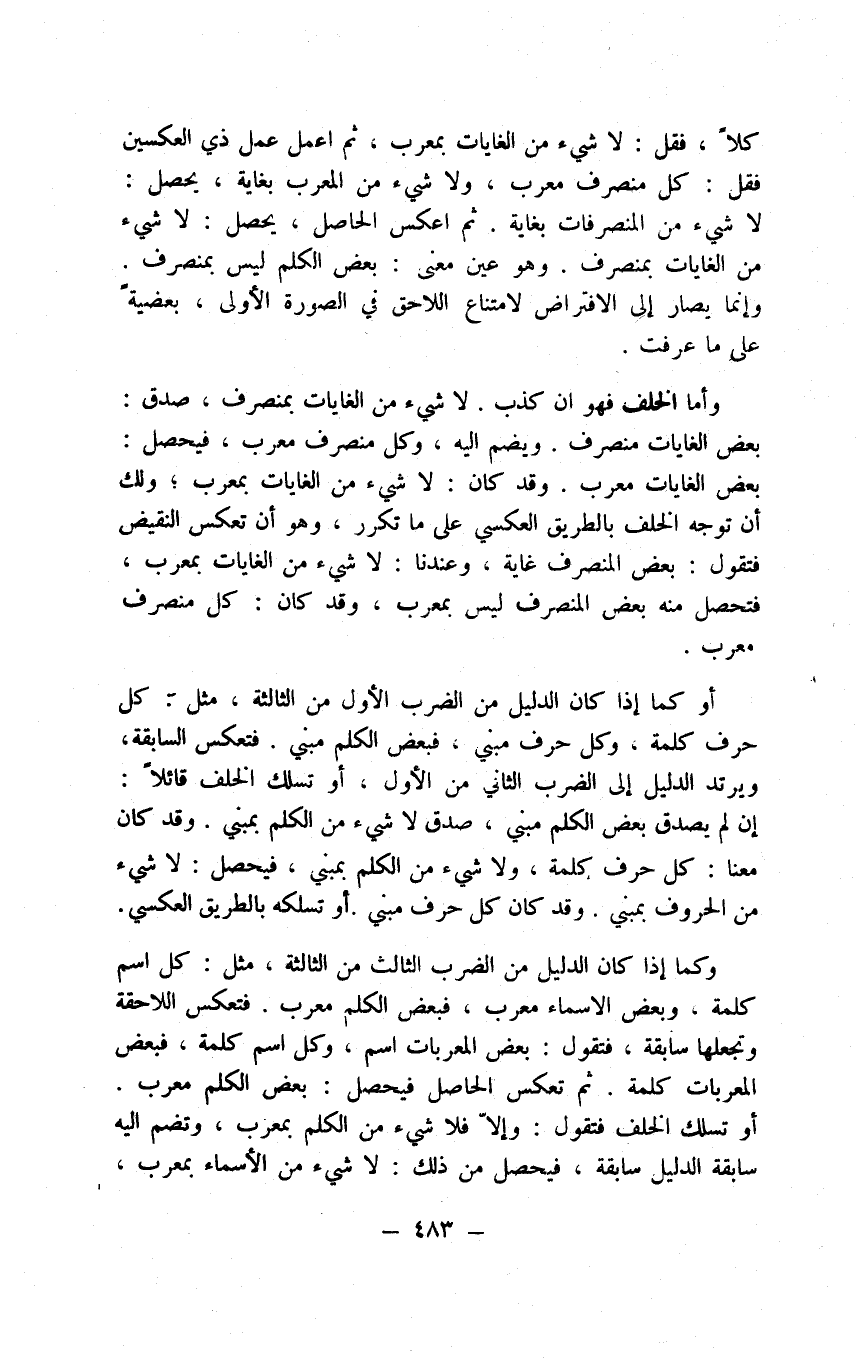 إنك بعد أن وقفت على خواص تركيب الاستدلالات في الفصل السابق مع أصولها المحتاج إليها وفروعها اللائقة بها لا نراك تفتقر في هذا الفصل إلا مجرد الوقوف على الأحوال في الشرط من الإثبات والنفي والتقييد بالكل والبعض والإهمال ومن التناقض والانعكاس فحري بنا إن نوفقك على ذلك فنقول وبالله التوفيق: أما الشرط فقد وقفت على كلماته في علم النحو وعلى تحقيقه في علم المعني فلا نعيد ذلك ولكن الأصحاب ألحقوا بكلمات الشرط كلما وإن كانت أصول النحو تأبى ذلك لما تقرر أن كلمات الشرط حقها أن تجزم، وليس هو من الجزم في شيء، وإنما هو كل الشمول قد دخل على ما المصدرية المؤدية معنى الظرف على نحو أتيتك مقدم الحاج وانتصب في قولك كلما أكرمتني أكرمتك لإضافته على الظرف مفيدا معنى كل وقت إكرامك إياي أكرمك، واصطلحوا في كلمة الترديد، وهي إما على تسميتها كلمة شرط، وليس من الشرط في شيء وإنما حاصله ترديد المبتدأ قبل دخول العوامل وبعده بين خبرين أو أكثر كقولك زيد إما قائم وإما قاعد وإما وإما وإن إما قائم وإما قاعد وكائن زيد إما قائما وإما قاعدا وأظن إما قائما وإما قاعدا، وكقولك زيد إما أن