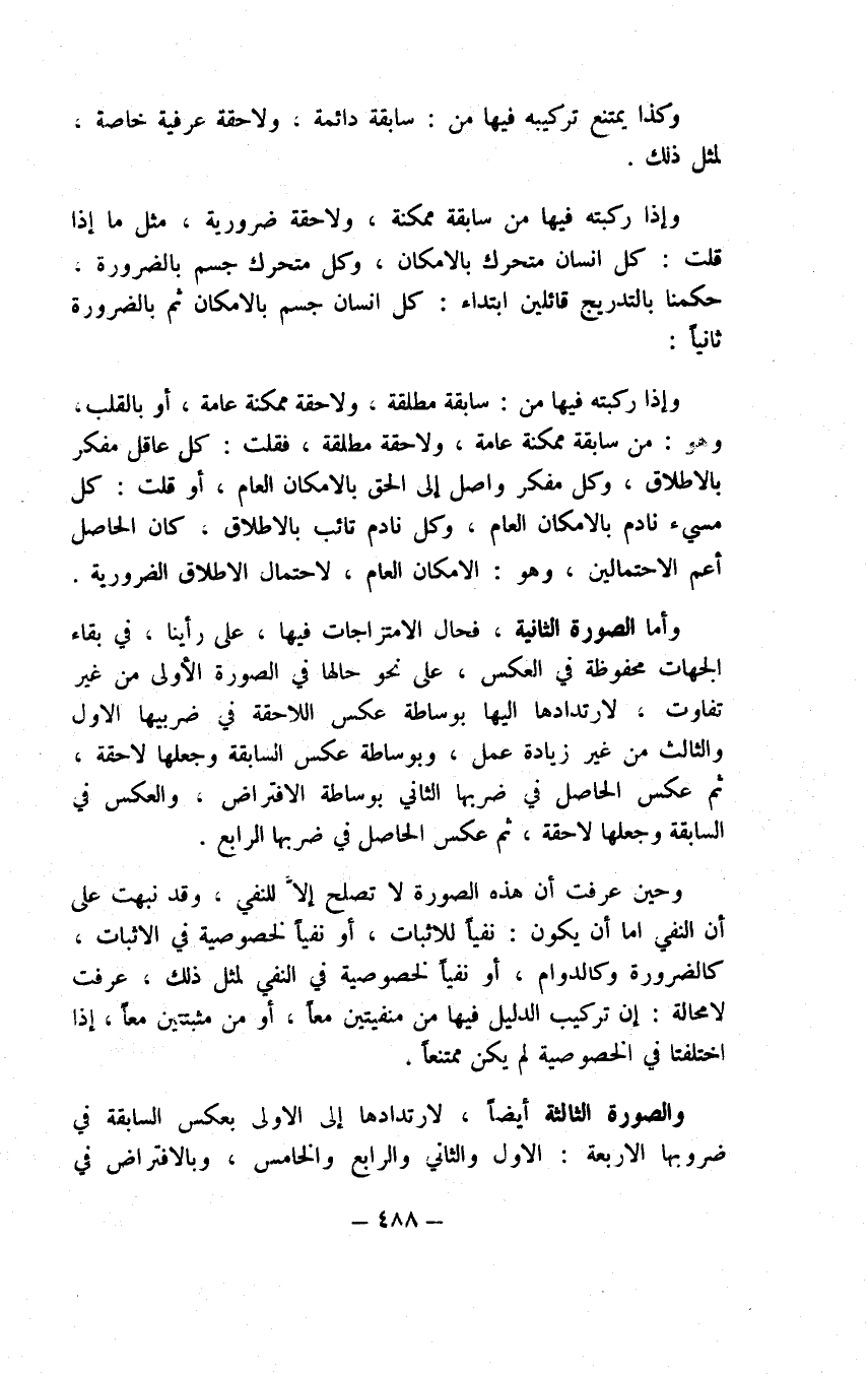 وأما الشرطيات المنفصلة فليست إلا خبريات على ما عرفناك من الأصل في إما لا فرق إلا أن في الخبريات في النفي أو الإثبات تعين الخبر للمبتدأ والمنفصلة لا تعينه وإنما تجعله أحد ما تعدد إما فتركب الدليل منها على نحو تركيبه من الخبريات، ووضع الدليل: إما أن يكون من شرطيتين متصلتين أو منفصلتين، أو من سابقة متصلة ولاحقة منفصلة أو بالعكس فهذه أقسام أربعة، ونحن نورد من كل واحد منها مثالا في كل واحدة من الصور في ضرب واحد ليقاس عليه سائر الضروب، نقول في الأولى من القسم الأول كلما كانت الكلمة مستعملة في معناها كانت حقيقة بالتصريح، وكلما كانت حقيقة بالتصريح كانت في الاستعمال مستغنية عن قرينة فيحصل كلما كانت مستعملة في معناها كانت في الاستعمال مستغنية عن قرينة. ومن القسم الثاني دائما كل مزيد: إما أن يكون م للإلحاق، وإما أن يكون م لغير الإلحاق، ودائما كل مزيد للإلحاق: إما أن يكون ملحقا بالرباعي، وإما أن يكون ملحقا بالخماسي، ودائما كل مزيد لغير الإلحاق: إما أن يكون مزيد ثلاثي وإما مزيد رباعي وإما مزيد خماسي فيحصل دائما كل مزيد: إما ملحق بالرباعي، وإما ملحق بالخماسي