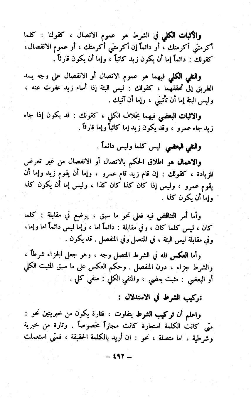 تركيب الدليل في هذا الفصل في كل صورة من الصور الأربع لا يزيد على أربعة أقسام: وهي أن تكون السابقة خبرية واللاحقة إما متصلة وإما منفصلة، وأن تكون اللاحقة خبرية والسابقة إما متصلة وإما منفصلة، وقد عرفت جميع ذلك فاعتبر التركيبات بنفسك
