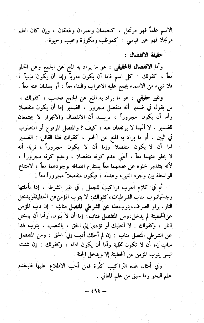 فصل عنه ذكر الحاصل من جملتيه كما إذا قلت كل جسم قرين كون في جهة معينة وكل كون في جهة معينة حادث وكل قرين حادث حادث وكل جسم حادث ولك أن تجعل الوصل عبارة عن أن يوصل الدليل بالتصريح بجميع ما لابد منه في استلزامه للمطلوب والفصل عبارة عن ترك شيء إذا علم موقعه فنقول في قولك هذا مساو لذلك وذاك مساو لذلك فهذا مساو لذلك إنه مفصول، وفي قولك هذا مساو لذاك وذاك مساو لذلك وكل لمساو لشيء مساو لذلك الشيء فهذا مساو لذلك أنه موصول وأن تقول في قولك إن كانت الشمس طالعة فالنهار موجود وإن كان النهار موحوداً فالأعشى يبصر والشمس طالعة فالأعشى يبصر أنه مفصول وفي قولك والشمس طالعة فالنهار موجود فالأعشى يبصر أنه موصول. والقياس الاستثنائي عبارة عن الاستدلال بثبوت الملزوم على ثبوت لازمه وبنفي اللازم على انتفاء ملزومه دون مقابليهما إلا فيما كان اللازم مساويا لكن ذلك لا يكون عن قوة النظم مثال الاستدلال بثبوت الملزوم على ثبوت اللازم إن كان هذا إنسانا فهو حيوان لكنه انسان فيحصل هو حيوان ومثال الاستدلال بنفي اللازم على انتفاء ملزومه إن كان إنسانا فهو حيوان لكنه ليس بحيوان فيحصل ليس هو بإنسان وهو من الدلالات الواضحة المستلزم تكذيبها الجمع بين النقيضين استلزاما ظاهرا، ولك تنزل الأول منهما منزلة الضرب الثاني من الصورة الأولى لأن قولنا إن كان هذا إنسانا فهو حيوان في قوة كل إنسان حيوان فتجعله لاحقة وتجعل قولك لكنه إنسان وهو في قوة هو إنسان سابقة وتركب الدليل هكذا هو إنسان وكل إنسان حيوان فيحصل هو حيوان وأن تنزل الثاني