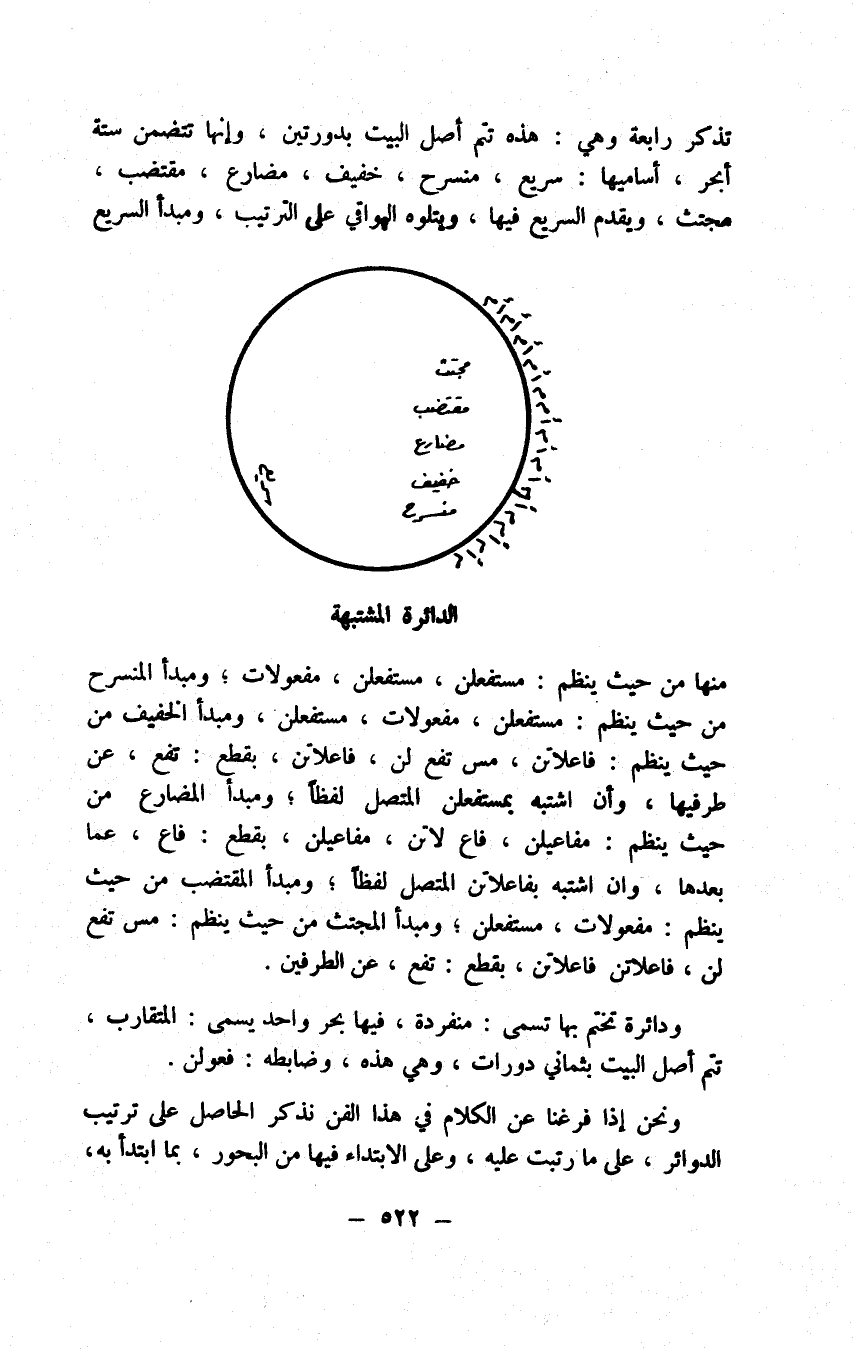 واعلم أن للأخفش روايات في الأعاريض والضروب رأيت تركها أولى فاعلم، زحافه يجري القبض في كل فعولن إلا في الواقع ضربا، ويجري القبض والكف في كل مفاعيلن إلا في الواقع ضربا. وعن أبي إسحق رحمه الله أن فعولن السابق على الضرب الثالث قلما يجيء سالما، ولقد صدق والسبب في ذلك هو أنه إذا صح اتفق الجزآن في الربع الأخير من البيت ووضع الدائرة على اختلاف في جزأيها فيختار قبضة توصلا على تحصيل اختلاف بينهما، ويجري الثلم والترم في فعولن الصدري وبين ياء مفاعيلن ونونه معاقبة، بيت المقبوض: