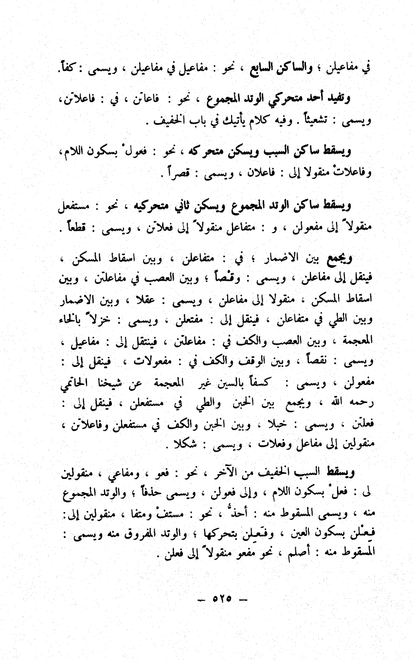 لكن الافتتاح بترك الأصل لا لضرورة موجبة كالخرم أو الخزم غير مناسب فليتأمل فيه. زحافه يجري الخبن في كل فاعلن إلا في الواقع عروضا وضربا، ويجري في كل فاعلاتن الخبن، وكذا الكف والشكل إلا في الضرب فإنهما لا يجريان فيه وبين نون فاعلاتن وألف فاعلن وفاعلاتن بعدها معاقبة، وأما فاعلان فبعضهم لا يجيز خبنه وبعضهم يجيزه مستشهدا بقوله:
