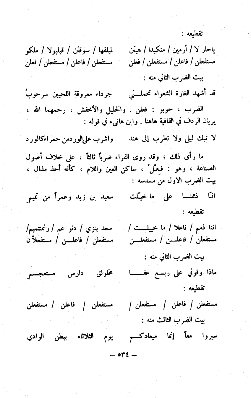 تقطيعه: مفتعلن ستا وإنما يحكم لهذه الأبيات الثلاثة بكونها مزاحف الكامل إذا وجدت معها في القطعة أو القصيدة متفاعلن، بيت المضمر المرفل: