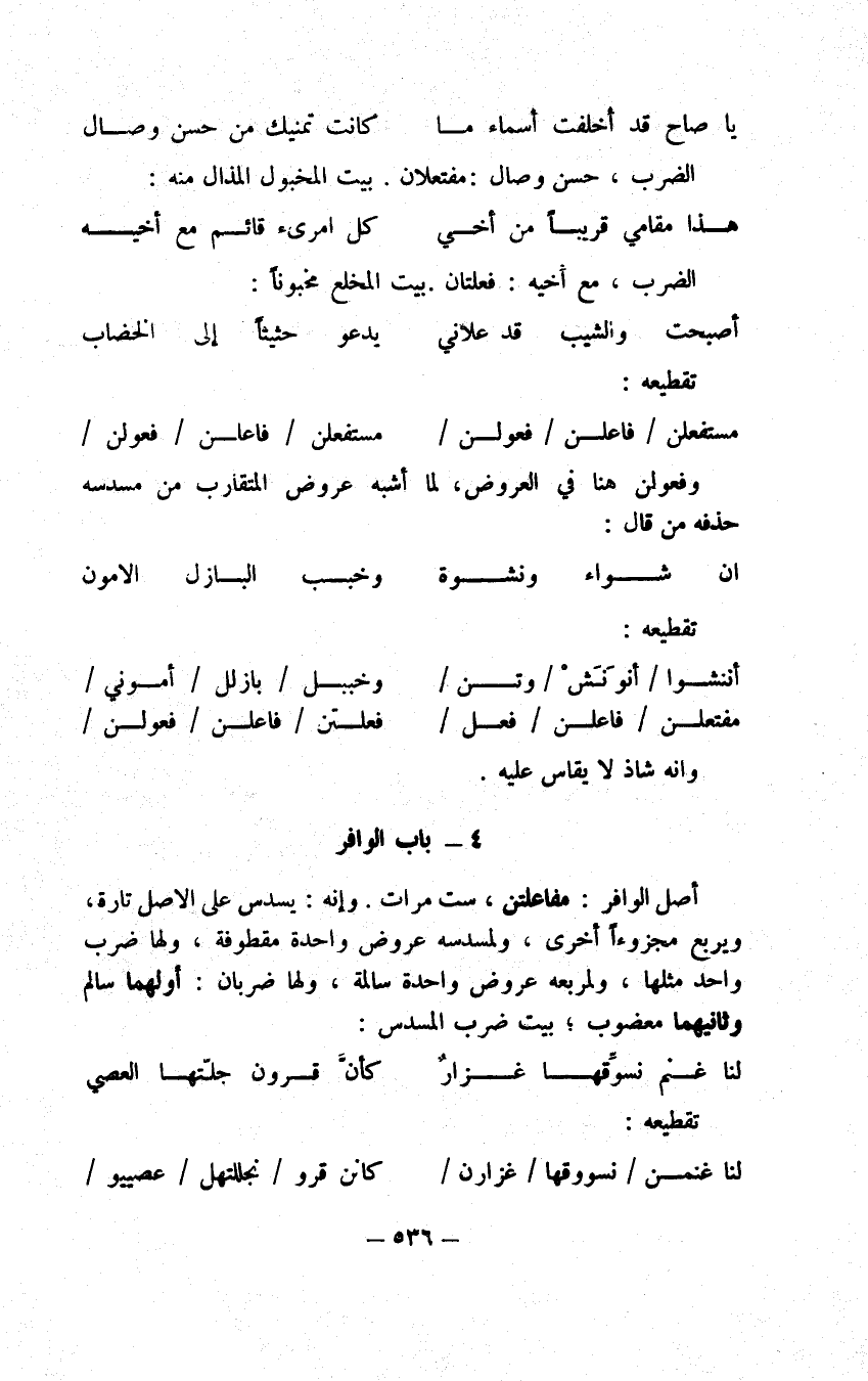 أصل الرجز مستفعلن ستا، وهو في الاستعمال يسدس تارة على الأصل ويربع مجزوا أخرى ويثلث مشطورا ثالثة على غير قول الخليل كان الشعر عند الخليل هو ما له مصراعان وعروض وضرب، ولعل الحق في يده لما في العرف من إجراء لفظ البيت على الشعر وامتناع إجرائه على المصراع ويثنى منهوكا رابعه على قول الخليل ومن تابعه دون الأخفش ويوحد مشطور منهوك على قول الزجاج وحده ولمسدسه عروض واحدة سالمة، وضربان سالم ومقطوع ولمربعه عروض وضروب سالمان وعروض مشطورة سالمة وهي ضربه، وعروض مثناه كذلك، بيت الضرب الأول من مسدسه: