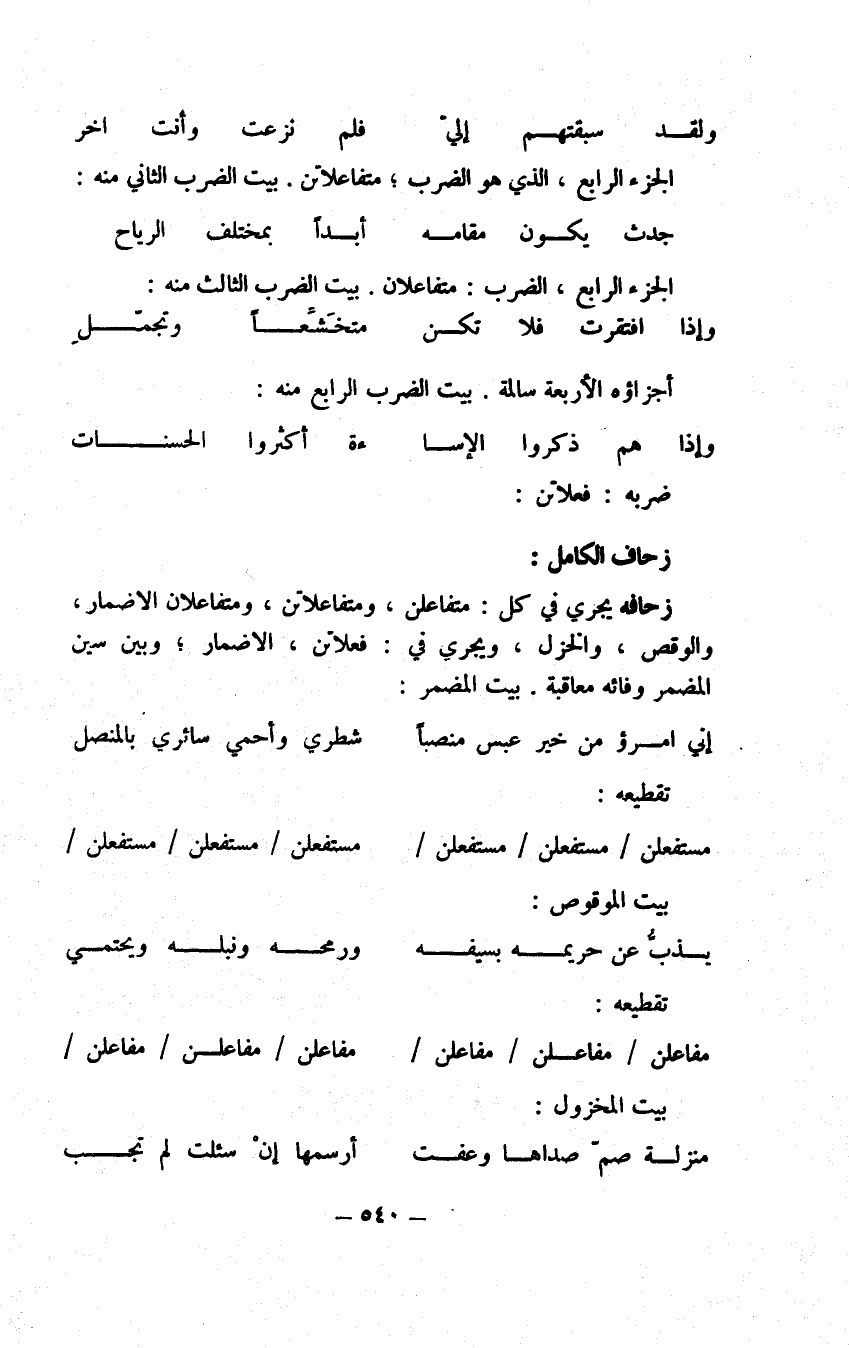 ثم قوله بؤسا للحرب هذا قول أبي إسحاق في هذا الوزن ولم يذكره الخليل أصلا، وأما البهرامي فقد عده من مربع المديد وتبعه جار الله فالقول الأول إذا تأملت مبنى على أنه مجزو أصله والقول الثاني مبني على أنه مشطور أصله فكن الحاكم بينهما.