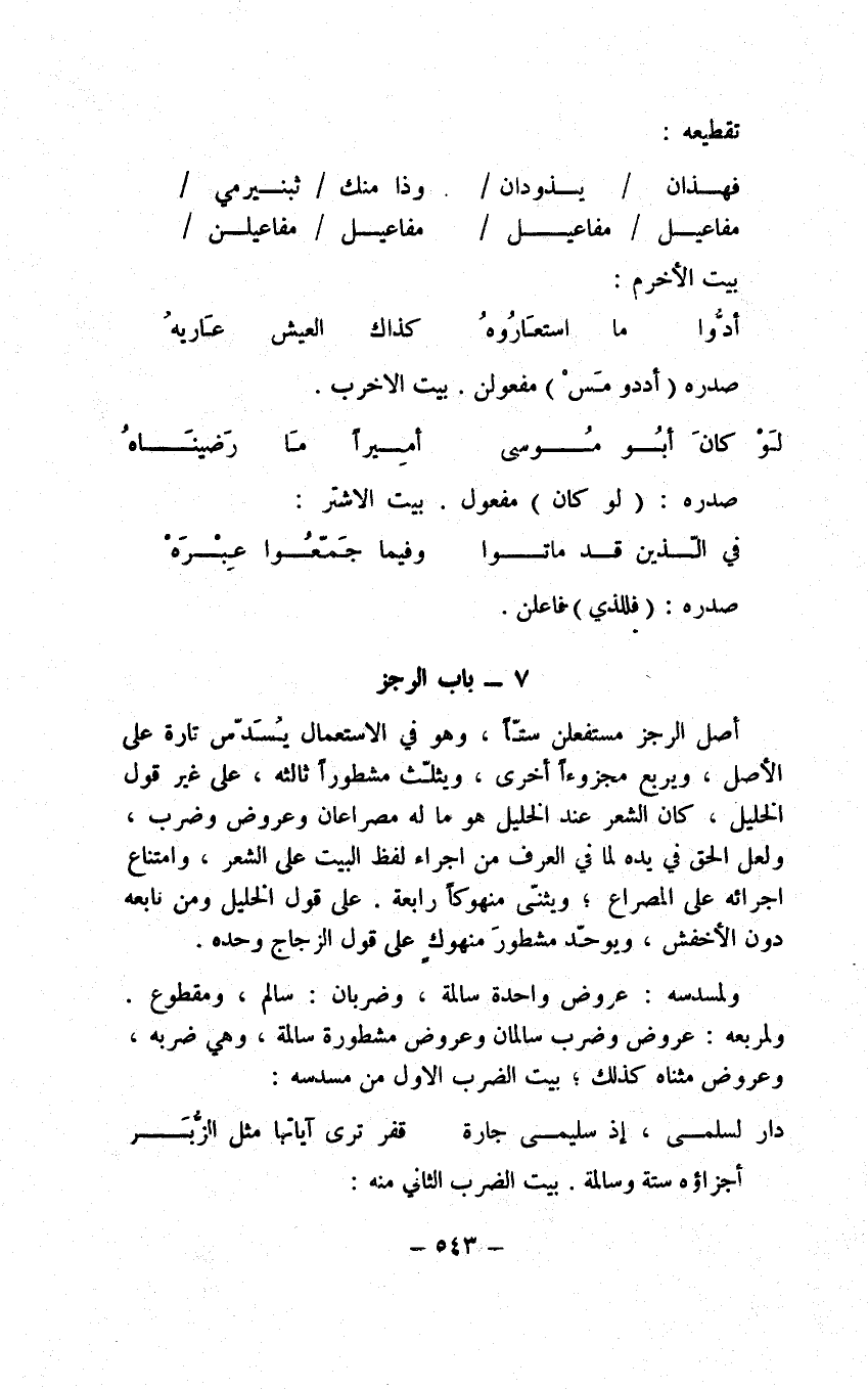 تقطيعه: مستفعلن مستفعلن مفعولن، وإنما لا يحمل هذا عندنا على مشطور الرجز المقطوع العروض لأن حمله على ذلك يستدعي إسقاط حرف مع إسقاط حركة وحمله على هذا يستدعي إسقاط حرف فحسب لكون الحركة ساقطة بحكم كون حرفها موقوفا عليه: أي لكون حركة التاء من مفعولات ساقطة في الاستعمال سقوطا لا ظهور لها إلا في الدائرة فتأمله وأحذ على ما سمعت متى اعترضك موضع صالح الحمل على وجهين.