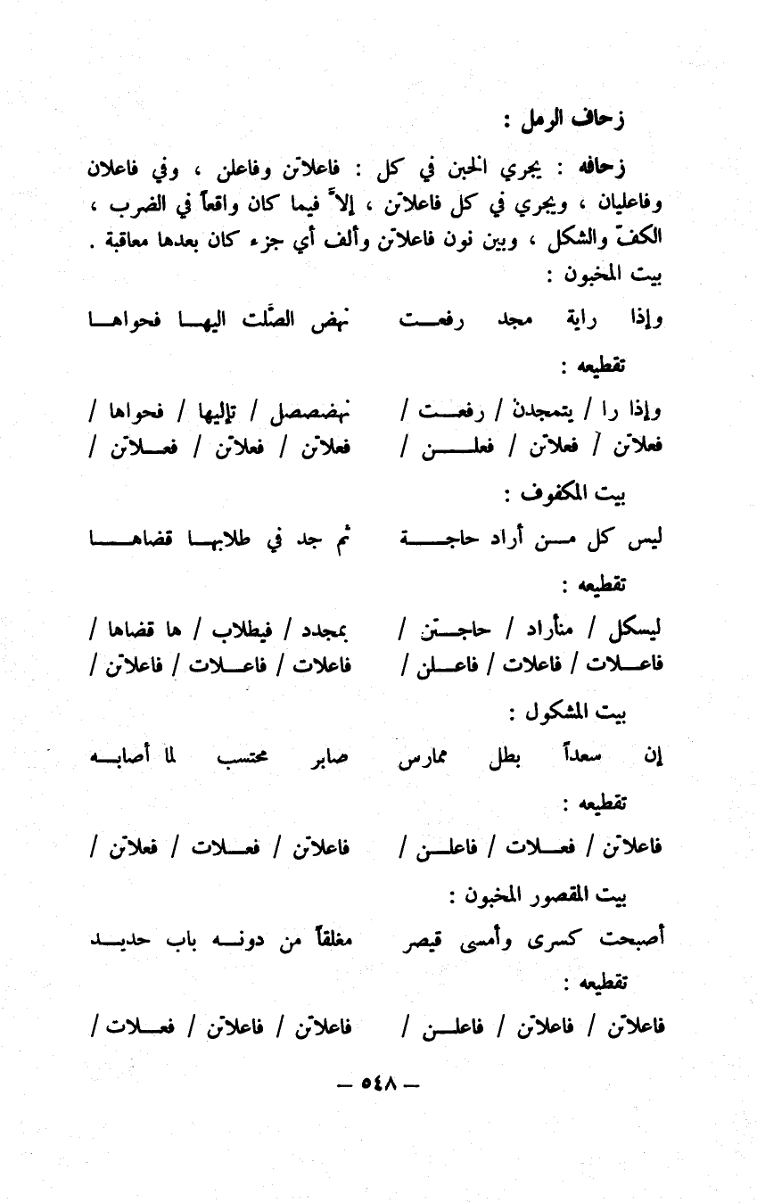 تقطيعه: فاعلاتن مس تفع فاعلاتن فعولن، ويلزم هذا الضرب عند الخليل الردف، وقد رأى بعض أصحاب هذه الصناعة في فعولن هذه حملها على خبن مس وكسف تفع من مس تفع لن مخطئا حامليه على الخبن والقصر يستلزم في علم القافية كون الروي من الوتد الذي هو الآن لام فعولن وكون وصل الروى من السبب وهو نونه، ولازم نظير لهذا المستلزم فإن الروي والوصل يكونان من جزء واحد: أي سبب أو وتد. لكن هذا الرأي يستلزم كسف الوتد في غير آخر الجزء، ولا نظير لهذا المستلزم أيضا، وإن شئت فتأمل زحافات فاع لاتن في المضارع كيف تجد فاع ممتنعا عن الكسف. وأما امتناع حمل فعولن هذه على القطع فظاهر لفقد الوتد المجموع إذا تأملت.